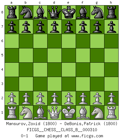 Last move : 0-1 2019 October 10 13:40:0 [Event "FICGS__CHESS__CLASS_B__000310"] [Site "FICGS"] [Date "2019.08.31"] [Round "1"] [White "Mansurov,Zoxid"] [Black "DeBonis,Patrick"] [Result "0-1"] [WhiteElo "1800"] [BlackElo "1800"] 0-1 This chess game has been lost on time (started : 2019.08.31 4:59:10) Player Black won this chess game. Follow this game move after move (download)The Pin is mightier than the sword. (Fred Reinfeld) Wer nie einen Fehler gemacht hat, hat nie etwas Neues ausprobiert. (Albert Einstein) Si pudieramos observar el interior de la cabeza de un jugador de Ajedrez, encontraríamos ahí un mundo lleno de sentimientos, imágenes, ideas, emoción y pasión. (Alfred Binet) Le pion, dans sa simplicité, marche droit devant lui, mais lorsqu'il prend, il le fait obliquement? Ainsi l'homme, tant qu'il reste pauvre, marche dans la droiture et vit honnêtement, mais lorsqu'il recherche les honneurs, il flatte, se parjure et, par les voies obliques, cherche une position supérieure sur l'échiquier du monde. (Jean de Galles) Wisdom begins at the end. (Daniel Webster)