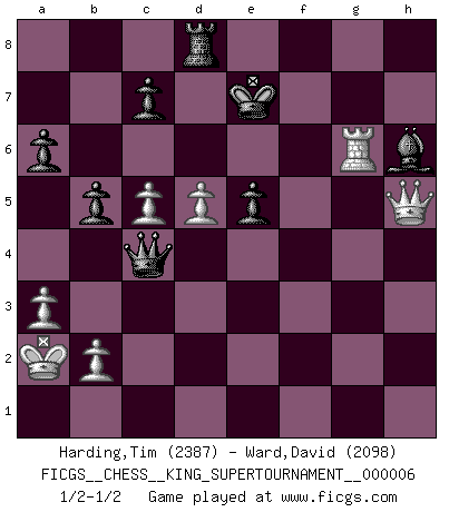 Last move : 1/2-1/2 2019 November 25 19:17:1 [Event "FICGS__CHESS__KING_SUPERTOURNAMENT__000006"] [Site "FICGS"] [Date "2019.09.02"] [Round "1"] [White "Harding,Tim"] [Black "Ward,David"] [Result "1/2-1/2"] [WhiteElo "2387"] [BlackElo "2098"] 1.e4 e5 2.f4 exf4 3.Nf3 d6 4.d4 g5 5.g3 g4 6.Nh4 f3 7.Nc3 Nc6 8.Be3 Be7 9.Qd2 h6 10.O-O-O a6 11.Nf5 Bxf5 12.exf5 Qd7 13.h3 Qxf5 14.hxg4 Qxg4 15.Bh3 Qg6 16.Nd5 Bd8 17.Bf1 Nce7 18.Nf4 Qf5 19.Nh5 Kf8 20.Bd3 Qd7 21.Nf6 Nxf6 22.Bxh6+ Ke8 23.Bg7 Rxh1 24.Rxh1 Nfg8 25.Qg5 Qe6 26.c4 Ng6 27.Qd2 Qg4 28.Kb1 Qxg3 29.Re1+ Be7 30.d5 Ne5 31.Bxe5 dxe5 32.Qe3 Nf6 33.Rf1 Ng4 34.Rxf3 Qg2 35.Qe4 Rb8 36.Bf1 Nf2 37.Qe2 Qg6+ 38.Ka1 Ng4 39.Bh3 f5 40.Rg3 Qh6 41.a3 Qh4 42.Qg2 b5 43.Bxg4 fxg4 44.Rxg4 Qf6 45.Rg8+ Bf8 46.c5 Kf7 47.Rg3 Bh6 48.Qh3 Rd8 49.Qh5+ Ke7 50.Rg6 Qf1+ 51.Ka2 Qc4+ 52.Ka1 Qc1+ 53.Ka2 Qc4+ 54.Ka1 Qc1+ 55.Ka2 Qc4+ 1/2-1/2 KGA : Fischer defense Queenside Castling by player White (move 10) This chess game ended in a draw. Follow this game move after move (download)After black's reply to 1.e4 with 1..e5, leaves him always trying to get into the game. (Howard Staunton) Obwohl ich vom Stil her kaum zu den Priestern der Schachkunst gezählt werde, halte ich Schach doch für eine Kunst. (Tigran Petrosjan) Durante una competencia de Ajedrez, un Maestro de Ajedrez deberá ser una combinación de presa de caza y un Monge. (Alexander Alekhine) La menace est plus forte que l'exécution. (Aaron Nimzovitch) Creativity is inventing, experimenting, growing, taking risks, breaking rules, making mistakes, and having fun. (Mary Lou Cook)
