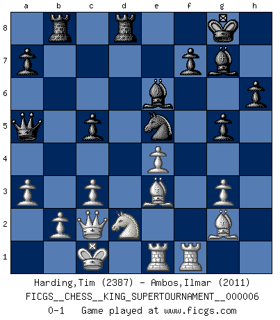 Last move : 0-1 2019 September 16 20:32:42 [Event "FICGS__CHESS__KING_SUPERTOURNAMENT__000006"] [Site "FICGS"] [Date "2019.09.02"] [Round "1"] [White "Harding,Tim"] [Black "Ambos,Ilmar"] [Result "0-1"] [WhiteElo "2387"] [BlackElo "2011"] 1.e4 e5 2.f4 exf4 3.Nf3 h6 4.d4 g5 5.Nc3 Bg7 6.g3 fxg3 7.hxg3 d6 8.Be3 Nf6 9.Qd3 Ng4 10.Bg1 O-O 11.O-O-O Nd7 12.Nd5 Re8 13.Re1 c6 14.Ne3 Nxe3 15.Bxe3 c5 16.c3 b5 17.dxc5 dxc5 18.Qxb5 Rb8 19.Qd3 Qa5 20.a3 Nf6 21.Nd2 Be6 22.Bg2 Ng4 23.Rhf1 Ne5 24.Qc2 Red8 0-1 KGA : Becker defense Kingside Castling by player Black (move 10) Queenside Castling by player White (move 11) Player Black won this chess game. Follow this game move after move (download)Daring ideas are like Chess men moved forward. They may be beaten, but they may start a winning game. (Johann Wolfgang von Goethe) Die Auseinandersetzung mit Karpow war politisch geprägt. Er stand für das kommunistische System, wurde von dessen Repräsentanten gehätschelt. Ich war der Oppositionelle. Jeder Schachweltmeister spiegelt auch die gesellschaftlichen Verhältnisse wider. Kramnik steht für die Börsen-Generation des Neuen Markts, ideologiefrei, zahlenfixiert. (Garry Kasparov) Cuando estes solo, cuando te sientas un extraño en el mundo, juega al Ajedrez. Esto levantará tu espiritu y será tu consejero de guerra. (Aristóteles) Plusieurs personnes se sont demandées comment Tal faisait pour gagner... En fait, c'est très simple ! Il met ses pièces au centre de l'échiquier et les sacrifie quelque part ! (David Bronstein) Vladimir Ras-Putin is still alive... He is also a good actor, I saw him in the Lord of the Rings. (Rodolfo d'Ettorre)