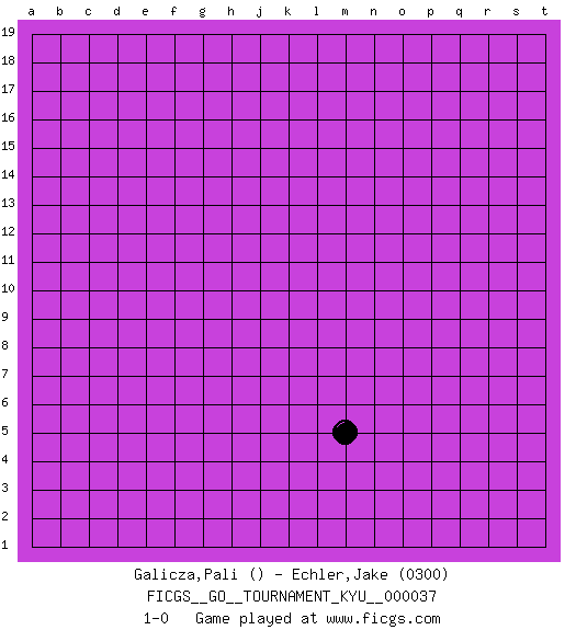 Last move : 1-0 2007 July 22 12:17:29 [Event "FICGS__GO__TOURNAMENT_KYU__000037"] [Site "FICGS"] [Date "2007.06.21"] [Round "1"] [Black "Galicza,Pali"] [White "Echler,Jake"] [Result "1-0"] [Rating 2 "0300"] 1.m5 1-0 This go game has been lost on time (started : 2007.06.21 21:37:48) Here are the names of the openings (joseki) played in the four corners : Corner q4 : m5 1-0 This joseki is unknown. A weak or weird move has probably been played in this corner. Player Black won this Go (weiqi, baduk) game. Follow this game move after move (download)Dead group ? Always win ko fights ! (Anonymous) Do you know these so called Volunteers don't even get paid! (Simpsons)