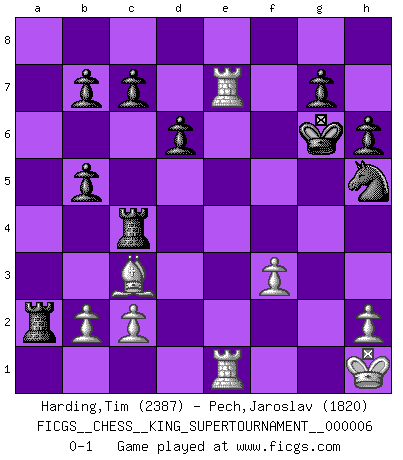 Last move : 0-1 2019 October 29 10:55:22 [Event "FICGS__CHESS__KING_SUPERTOURNAMENT__000006"] [Site "FICGS"] [Date "2019.09.02"] [Round "1"] [White "Harding,Tim"] [Black "Pech,Jaroslav"] [Result "0-1"] [WhiteElo "2387"] [BlackElo "1820"] 1.e4 e5 2.f4 Bc5 3.Nf3 d6 4.Nc3 Nf6 5.Bc4 Nc6 6.d3 Bg4 7.Na4 Bb6 8.Nxb6 axb6 9.O-O exf4 10.Bxf4 Nd4 11.Qd2 Nxf3+ 12.gxf3 Be6 13.Qc3 Qd7 14.Kh1 Nh5 15.Be3 Bxc4 16.dxc4 Qh3 17.Qe1 f5 18.exf5 O-O 19.Qf2 Rxf5 20.Qg2 Qxg2+ 21.Kxg2 Rfa5 22.Rae1 Rxa2 23.Bd4 R8a4 24.Re8+ Kf7 25.Rfe1 Rxc4 26.R8e7+ Kg6 27.Bc3 b5 28.Kh1 h6 0-1 KGD : Classical variation Kingside Castling by player White (move 9) Kingside Castling by player Black (move 18) Player Black won this chess game. Follow this game move after move (download)Different people feel differently about resigning. (Bobby Fischer) Ich habe die Schachforschung dermaßen betrieben, dass sie auf eine wissenschaftliche Basis gestellt wurde. (Mikhail Moiseyevich Botvinik) El hombre es un frívolo, una creatura engañosa y como un jugador de Ajedrez, se preocupa mas por el proceso de obtener su meta que de la meta por sí misma. (Dostoyevsky) Le système Elo représente seulement une moyenne. Il est simplement un indicateur de votre stabilité. (Anatoli Karpov) When you've done things right people won't know you've done anything at all. (Futurama)