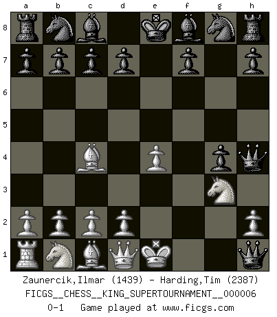 Last move : 0-1 2019 September 3 14:33:58 [Event "FICGS__CHESS__KING_SUPERTOURNAMENT__000006"] [Site "FICGS"] [Date "2019.09.02"] [Round "1"] [White "Zaunercik,Ilmar"] [Black "Harding,Tim"] [Result "0-1"] [WhiteElo "1439"] [BlackElo "2387"] 1.e4 e5 2.f4 exf4 3.Nf3 g5 4.Bc4 g4 5.Nd4 Qh4+ 6.g3 fxg3 7.Nf5 g2 8.Ng3 gxh1Q+ 0-1 KGA : King's knight's gambit Promotion Queen by player Black (move 8) Player Black won this chess game. Follow this game move after move (download)When you absolutely don't know what to do anymore, it is time to panic. (John van der Wiel) Es gibt zwei Arten von Opfern: Korrekte und meine. (Mikhail Nekhemyevich Tal) Cuando estes solo, cuando te sientas un extraño en el mundo, juega al Ajedrez. Esto levantará tu espiritu y será tu consejero de guerra. (Aristóteles) Mais l'homme est une créature légère et illogique : semblable au joueur d'échecs, il n'aime que le processus du but à atteindre, non le but lui-même. (Dostoïevsky) The ego is not master in its own house. (Sigmund Freud)