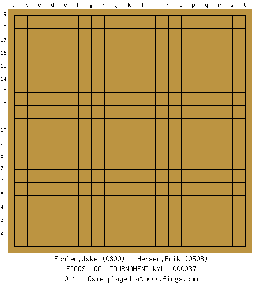 Last move : 0-1 2007 July 22 0:15:10 [Event "FICGS__GO__TOURNAMENT_KYU__000037"] [Site "FICGS"] [Date "2007.06.21"] [Round "1"] [Black "Echler,Jake"] [White "Hensen,Erik"] [Result "0-1"] [Rating 1 "0300"] [Rating 2 "0508"] 0-1 This go game has been lost on time (started : 2007.06.21 21:37:48) Here are the names of the openings (joseki) played in the four corners : Player White won this Go (weiqi, baduk) game. Follow this game move after move (download)If you don't know ladders, don't play go. (Anonymous) Unless in communicating with it one says exactly what one means, trouble is bound to result. (Alan Turing, about computers)