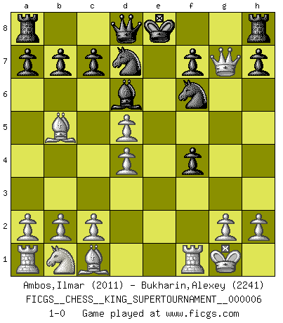 Last move : 1-0 2019 October 9 22:52:56 [Event "FICGS__CHESS__KING_SUPERTOURNAMENT__000006"] [Site "FICGS"] [Date "2019.09.02"] [Round "1"] [White "Ambos,Ilmar"] [Black "Bukharin,Alexey"] [Result "1-0"] [WhiteElo "2011"] [BlackElo "2241"] 1.e4 e5 2.f4 exf4 3.Nf3 g5 4.d4 g4 5.Ne5 Nf6 6.Bc4 d5 7.exd5 Bd6 8.O-O Nh5 9.Bb5+ Bd7 10.Nxd7 Nxd7 11.Qxg4 Nhf6 12.Qg7 1-0 KGA : Soerensen gambit Kingside Castling by player White (move 8) Player White won this chess game. Follow this game move after move (download)In complicated positions, Bobby Fischer hardly had to be afraid of anybody. (Paul Keres) Je mehr ich von der FIDE weiss, um so weniger verstehe ich. (Alexander Kalifman) El Ajedrez expande y enriquece tu mente. (Saudin Robovic) Demandez au pauvre Cg1 ce qu'il en pense. Eduard Gufeld à propos de la variante Saemisch de l'Est-Indienne. Horse racing is animated roulette. (Roger Kahn)