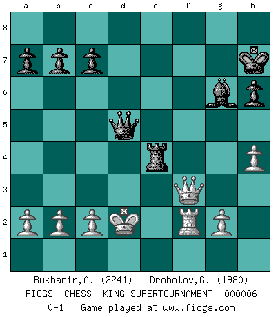 Last move : 0-1 2019 November 15 11:40:15 [Event "FICGS__CHESS__KING_SUPERTOURNAMENT__000006"] [Site "FICGS"] [Date "2019.09.02"] [Round "1"] [White "Bukharin,Alexey"] [Black "Drobotov,Gennady"] [Result "0-1"] [WhiteElo "2241"] [BlackElo "1980"] 1.e4 e5 2.f4 exf4 3.Nf3 d6 4.Bc4 Nc6 5.d4 g5 6.h4 Na5 7.Bd3 g4 8.Ng5 h6 9.Nxf7 Kxf7 10.Bxf4 Kg7 11.Nc3 Nc6 12.Ne2 Qe7 13.Qd2 Nf6 14.O-O-O Nxe4 15.Bxe4 Qxe4 16.d5 Ne5 17.Ng3 Qg6 18.Qd4 Kg8 19.Bxe5 dxe5 20.Qxe5 Bd6 21.Qc3 Kh7 22.Rde1 Rf8 23.Ne4 Bf5 24.Nxd6 Qxd6 25.Rhf1 Bg6 26.Qd4 Rae8 27.Qxg4 Rf2 28.Rxf2 Rxe1+ 29.Kd2 Re4 30.Qf3 Qxd5+ 0-1 KGA : Fischer defense Queenside Castling by player White (move 14) Player Black won this chess game. Follow this game move after move (download)Play the opening like a book, the middle game like a magician, and the endgame like a machine. (Spielmann) Karpov ist ein Museumsstück. (Garry Kasparov) Desconfianza es la característica mas necesaria de un jugador de Ajedrez. (Siegbert Tarrasch) Les ravages du H expliquent la différence de niveau entre Tal et Thal [Abergel]. I teach you to lie, cheat and steal, and as soon as my back's turned you wait in line ? (Gregory House, House M.D.)