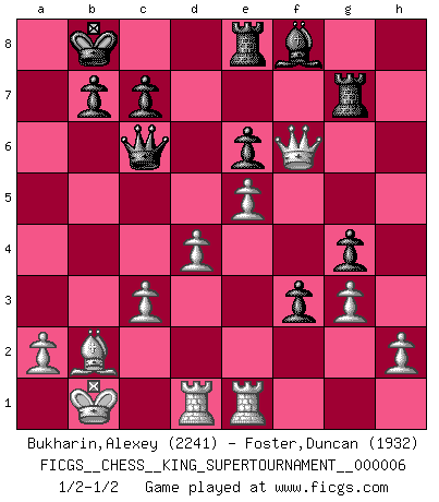 Last move : 1/2-1/2 2019 December 31 2:47:12 [Event "FICGS__CHESS__KING_SUPERTOURNAMENT__000006"] [Site "FICGS"] [Date "2019.09.02"] [Round "1"] [White "Bukharin,Alexey"] [Black "Foster,Duncan"] [Result "1/2-1/2"] [WhiteElo "2241"] [BlackElo "1932"] 1.e4 e5 2.f4 exf4 3.Nf3 g5 4.Nc3 Bg7 5.d4 d6 6.g3 g4 7.Nh4 f3 8.Be3 Nf6 9.Qd2 d5 10.e5 Ne4 11.Nxe4 dxe4 12.O-O-O Nc6 13.Bc4 Be6 14.Bg5 Qd7 15.Bxe6 fxe6 16.Rhe1 h6 17.Bf4 O-O-O 18.c3 Ne7 19.Kb1 Qc6 20.Qc2 Rhf8 21.Rxe4 Nd5 22.Ng6 Rf7 23.R4e1 a5 24.Bd2 a4 25.Nf4 Nxf4 26.Bxf4 Bf8 27.Qg6 Rg7 28.Qxh6 a3 29.Bc1 axb2 30.Bxb2 Kb8 31.Qf6 Re8 1/2-1/2 KGA : Quaade gambit Queenside Castling by player White (move 12) Queenside Castling by player Black (move 17) This chess game ended in a draw. Follow this game move after move (download)I'm not afraid of Spassky. The world knows I'm the best. You don't need a match to prove it. (Bobby Fischer) Fischer: 'Remis!?' Uhlmann: 'Aber es muss doch dreimal Zugwiederholung sein!' Fischer: 'Sie nehmen das Remis an, wie ich es sage, sonst spiele ich weiter und werde Sie dann schlagen!' (Robert James Fischer) Jugadores de primera clase pierden en contra de jugadores de segunda clase porque los jugadores de segunda clase a veces juegan una partida de primer clase. (Siegbert Tarrasch) Avant la finale, les dieux ont créé le milieu de partie. (Tarrasch) Are you threatening me, Master Jedi ? (Chancellor Palpatine in Star Wars ep.3)