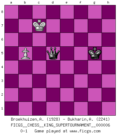 Last move : 0-1 2020 March 2 17:9:21 [Event "FICGS__CHESS__KING_SUPERTOURNAMENT__000006"] [Site "FICGS"] [Date "2019.09.02"] [Round "1"] [White "Broekhuizen,A. T. S."] [Black "Bukharin,Alexey"] [Result "0-1"] [WhiteElo "1928"] [BlackElo "2241"] 1.e4 e5 2.f4 exf4 3.Nf3 g5 4.Bc4 g4 5.O-O gxf3 6.Qxf3 Qf6 7.e5 Qxe5 8.Bxf7+ Kxf7 9.d4 Qf5 10.Qb3+ Qe6 11.Bxf4 Qxb3 12.axb3 Nf6 13.Nc3 Kg6 14.Bxc7 Na6 15.Rxf6+ Kxf6 16.Be5+ Kf7 17.Bxh8 Kg8 18.Rf1 Nb4 19.Be5 Nc6 20.Nd5 Nxe5 21.dxe5 Bc5+ 22.Kh1 b6 23.b4 Bf8 24.Nf6+ Kh8 25.b5 Bg7 26.h4 Bxf6 27.exf6 Kg8 28.g4 Bb7+ 29.Kg1 Rc8 30.Rd1 Rc7 31.Rd4 d5 32.c3 Rc4 33.Kf2 Rxd4 34.cxd4 Bc8 35.Kf3 Kf7 36.g5 Bd7 37.Kf4 Ke6 38.f7 Kxf7 39.Ke5 Bxb5 40.Kxd5 Kg6 41.Ke6 Bc4+ 42.Ke5 Kh5 43.d5 Bxd5 44.Kxd5 Kxh4 45.Kc6 Kxg5 46.Kb7 h5 47.Kxa7 h4 48.Kxb6 h3 49.b4 h2 50.b5 h1Q 51.Kc7 Qd5 0-1 KGA : Muzio gambit Kingside Castling by player White (move 5) 10 pieces endgame at move 40 : White KPPPP , Black KBPPP WHITE : King + 4 Pawns BLACK : King + 1 Bishop 3 Pawns 9 pieces endgame at move 43 : White KPPP , Black KBPPP WHITE : King + 3 Pawns BLACK : King + 1 Bishop 3 Pawns 8 pieces endgame at move 44 : White KPPP , Black KPPP WHITE : King + 3 Pawns BLACK : King + 3 Pawns 7 pieces endgame at move 44 : White KPP , Black KPPP WHITE : King + 2 Pawns BLACK : King + 3 Pawns 6 pieces endgame at move 45 : White KP , Black KPPP WHITE : King + 1 Pawn BLACK : King + 3 Pawns 5 pieces endgame at move 47 : White KP , Black KPP WHITE : King + 1 Pawn BLACK : King + 2 Pawns 4 pieces endgame at move 48 : White KP , Black KP WHITE : King + 1 Pawn BLACK : King + 1 Pawn Promotion Queen by player Black (move 50) Player Black won this chess game. Follow this game move after move (download)Don't even mention losing to me. I can't stand to think of it. (Bobby Fischer) Auf jeden Fall musst du zuerst Rechtsanwalt werden, damit du deine eigenen Interessen und die deiner Familie vertreten kannst. [Brief an seinen Sohn] (José Raúl Capablanca) El Ajedrez es imaginación. (David Bronstein) Seul un grand joueur sait à quel point il joue faiblement. (Xavier Tartacover) Control your own destiny or someone else will. (Jack Welch)