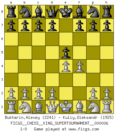 Last move : 1-0 2019 September 2 8:42:15 [Event "FICGS__CHESS__KING_SUPERTOURNAMENT__000006"] [Site "FICGS"] [Date "2019.09.02"] [Round "1"] [White "Bukharin,Alexey"] [Black "Kuliy,Oleksandr"] [Result "1-0"] [WhiteElo "2241"] [BlackElo "1925"] 1.e4 e5 2.f4 1-0 King's gambit Player White won this chess game. Follow this game move after move (download)I played Chess with him and would have beaten him sometimes only he always took back his last move, and ran the game out differently. (Mark Twain) Schach verlangt totale Konzentration. (Robert James Fischer) Tu sabes que vas a perder. Aún cuando tenía la ventaja, yo sabía que iba a perder. - al estar jugando con Fischer (Andrew Soltis) Ne tendez aucun piège pour le plaisir ! Ne jouez rien dans l'espoir que l'adversaire réagisse de façon stupide ! Prenez toujours pour acquis que l'adversaire va trouver le meilleur coup ! Ne jouez jamais de coup dans l'espoir que l'adversaire ne voie pas la menace ! Chacun de vos coups doit améliorer la position d'une façon ou d'une autre. If you are going through hell, keep going. (Winston Churchill)
