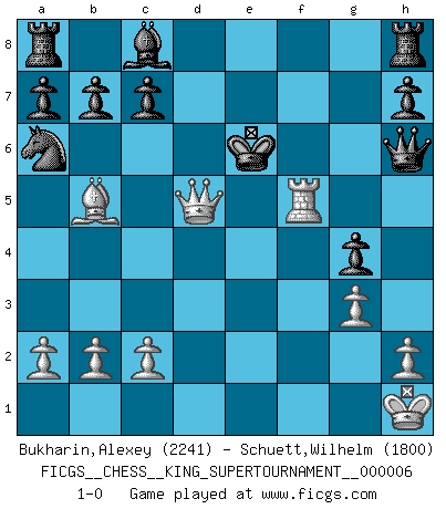 Last move : 1-0 2019 December 15 12:51:13 [Event "FICGS__CHESS__KING_SUPERTOURNAMENT__000006"] [Site "FICGS"] [Date "2019.09.02"] [Round "1"] [White "Bukharin,Alexey"] [Black "Schuett,Wilhelm"] [Result "1-0"] [WhiteElo "2241"] [BlackElo "1800"] 1.e4 e5 2.f4 exf4 3.Nf3 g5 4.Nc3 g4 5.Ne5 Nf6 6.Bc4 d5 7.exd5 Bd6 8.d4 Nh5 9.O-O Qh4 10.Bxf4 Nxf4 11.Rxf4 f6 12.Bb5+ Ke7 13.Qe2 fxe5 14.dxe5 Bc5+ 15.Kh1 Na6 16.Raf1 Kd8 17.e6 Bd6 18.g3 Qh6 19.Rf7 Be7 20.Rxe7 Kxe7 21.Rf7+ Kd6 22.Ne4+ Kxd5 23.Qc4+ Ke5 24.Qc3+ Kxe4 25.Qd3+ Ke5 26.Rf5+ Kxe6 27.Qd5+ 1-0 KGA : Quaade gambit Kingside Castling by player White (move 9) Player White won this chess game. Follow this game move after move (download)A man without frontiers. He didn't divide the East and the West, he brought them together in their admiration for him. (Ljubomir Ljubojevic, about Bobby Fischer's death) Karpov ist ein Museumsstück. (Garry Kasparov) Una compensación adecuada por un sacrificio es tener una combinación sólida que conduce a una posición ganadora; una compensación adecuada por una metida de pata es dejar a tu oponente arrebatar una derrota de las fauces de la victoria. (Bruce A. Moon) Les échecs, c'est l'art d'analyser. (Mikhail Botvinnik) They say in chess you've got to kill the queen, and then you mate it... Oh I, do you ? (Red Hot Chili Peppers, Fortune faded)