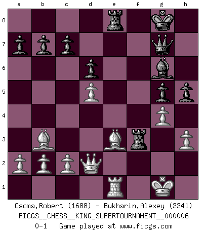 Last move : 0-1 2019 December 27 22:0:40 [Event "FICGS__CHESS__KING_SUPERTOURNAMENT__000006"] [Site "FICGS"] [Date "2019.09.02"] [Round "1"] [White "Csoma,Robert"] [Black "Bukharin,Alexey"] [Result "0-1"] [WhiteElo "1688"] [BlackElo "2241"] 1.e4 e5 2.f4 exf4 3.Nf3 g5 4.h3 Bg7 5.d4 d6 6.Nc3 Nc6 7.Bc4 h6 8.O-O Nge7 9.d5 Ne5 10.Nxe5 Bxe5 11.Bd2 Ng6 12.Rb1 O-O 13.Qh5 Bg7 14.Ne2 Ne5 15.Bb3 f5 16.exf5 Bxf5 17.Nd4 Bg6 18.Qd1 Bf7 19.Nf5 Qf6 20.Nxg7 Qxg7 21.Bc3 Bg6 22.Qd2 f3 23.g4 Rae8 24.Rbe1 Rf4 25.Bd4 h5 26.Be3 f2+ 27.Rxf2 Nf3+ 28.Rxf3 Rxf3 0-1 King's knight's gambit Kingside Castling by player White (move 8) Kingside Castling by player Black (move 12) Player Black won this chess game. Follow this game move after move (download)Your body has to be in top condition. Your Chess deteriorates as your body does. You can't separate body from mind. (Bobby Fischer) Wenn du gegen Bobby spielst, ist es keine Frage von gewinnen oder verlieren. Es ist eine Frage des Überlebens. (Boris Vassilievich Spassky) Estaba muy claro de que el punto vulnerable del Gran Maestro Americano (Bobby Fischer) radicaba en las posiciones de doble filo, colgantes, irracionales, donde el siempre falló en encontrar un triunfo aún en una posición de clara victoria. (Efim Geller) Vous savez, camarade Pachman, je n'éprouve pas de plaisir à être ministre, je jouerais plutôt aux échecs comme vous, ou alors ferais une révolution au Venezuela. (Che Guevara à Ludek Pachman, 'Checkmate in Prague', 1975) Ah, the Socrating method. The best way we have of teaching everything-apart from juggling chainsaws. (Gregory House, House M.D.)