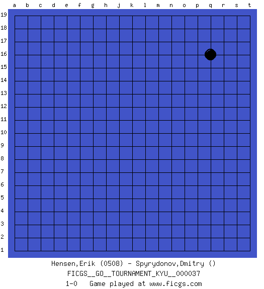Last move : 1-0 2007 June 22 22:10:30 [Event "FICGS__GO__TOURNAMENT_KYU__000037"] [Site "FICGS"] [Date "2007.06.21"] [Round "1"] [Black "Hensen,Erik"] [White "Spyrydonov,Dmitry"] [Result "1-0"] [Rating 1 "0508"] 1.q16 1-0 Here are the names of the openings (joseki) played in the four corners : Player Black won this Go (weiqi, baduk) game. Follow this game move after move (download)If a formation is symmetrical, play at the center. (Anonymous) Computer Science is no more about computers than astronomy is about telescopes. (Edsger W. Dijkstra)