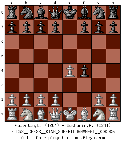 Last move : 0-1 2019 October 2 12:52:30 [Event "FICGS__CHESS__KING_SUPERTOURNAMENT__000006"] [Site "FICGS"] [Date "2019.09.02"] [Round "1"] [White "Valentin,Laurentiu"] [Black "Bukharin,Alexey"] [Result "0-1"] [WhiteElo "1284"] [BlackElo "2241"] 1.e4 e5 2.f4 exf4 0-1 This chess game has been lost on time (started : 2019.09.02 1:48:4) King's gambit accepted Player Black won this chess game. Follow this game move after move (download)If your opponent offers you a draw, try to work out why he thinks he's worse off. (Nigel Short) Ohne ihre Erfolge schmälern zu wollen würde ich sagen Petrosian, Spassky und Karpov verdanken ihre Siege ihren Trainern - Boleslavsky, Bondarevsky und Furman. (Mikhail Moiseyevich Botvinik) Desconfianza es la característica mas necesaria de un jugador de Ajedrez. (Siegbert Tarrasch) L'action d'une oeuvre littéraire se déroule sur un champ de bataille. Les masques et les types du drame moderne correspondent aux pièces du jeu d'échecs. L'intrigue correspond aux coups et aux gambits, c'est à dire aux techniques du jeu telles qu'utilisées et interprétées par les joueurs. Les tactiques et les péripéties [mouvements] correspondent aux coups exécutés par l'adversaire. (Viktor Shklovsky) When you stop learning you start dying. (M. Scott Adams)