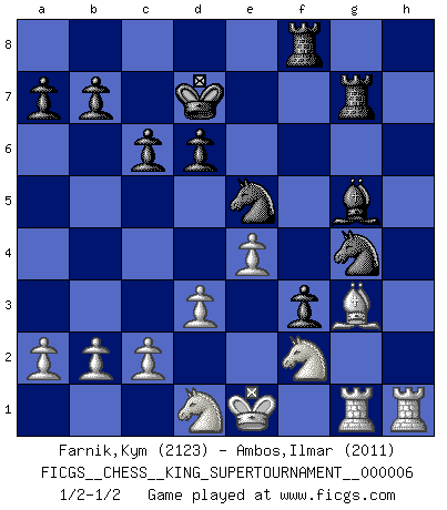 Last move : 1/2-1/2 2019 October 6 12:39:1 [Event "FICGS__CHESS__KING_SUPERTOURNAMENT__000006"] [Site "FICGS"] [Date "2019.09.02"] [Round "1"] [White "Farnik,Kym"] [Black "Ambos,Ilmar"] [Result "1/2-1/2"] [WhiteElo "2123"] [BlackElo "2011"] 1.e4 e5 2.f4 exf4 3.Bc4 Qh4+ 4.Kf1 d6 5.Nc3 Be6 6.Qe2 Nd7 7.Bxe6 fxe6 8.Qc4 O-O-O 9.Qxe6 g5 10.Qh3 Qxh3 11.Nxh3 Be7 12.d3 Rf8 13.Ke1 h6 14.g3 f3 15.Nf2 Ngf6 16.Be3 g4 17.Kd2 h5 18.Rag1 c6 19.h3 gxh3 20.Nxh3 Ne5 21.Rf1 Nfg4 22.Nd1 h4 23.Bf4 Kd7 24.gxh4 Rxh4 25.Bg3 Rh7 26.Nhf2 Bg5+ 27.Ke1 Rg7 28.Rfg1 1/2-1/2 KGA : Bishop's gambit Queenside Castling by player Black (move 8) This chess game ended in a draw. Follow this game move after move (download)Chess is a beautiful mistress. (Bent Larsen) Man gibt nur Pakete auf. (Paul Keres) El poder defensivo de una pieza clavada, solamente es imaginario. (Aaron Nimzovich) Les ravages du H expliquent la différence de niveau entre Tal et Thal [Abergel]. Don't be discouraged. It's often the last key in the bunch that opens the lock. (Author unknown)