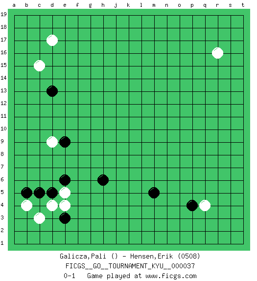 Last move : 0-1 2007 August 12 3:19:15 [Event "FICGS__GO__TOURNAMENT_KYU__000037"] [Site "FICGS"] [Date "2007.06.21"] [Round "1"] [Black "Galicza,Pali"] [White "Hensen,Erik"] [Result "0-1"] [Rating 2 "0508"] 1.d13 d17 2.h6 r16 3.m5 c15 4.c5 c3 5.e3 q4 6.p4 d4 7.d5 e5 8.e6 d9 9.e9 b4 10.b5 e4 0-1 This go game has been lost on time (started : 2007.06.21 21:37:48) Here are the names of the openings (joseki) played in the four corners : Corner d16 : d13 d17 This joseki is unknown. A weak or weird move has probably been played in this corner. Corner q4 : m5 q4 This joseki is unknown. A weak or weird move has probably been played in this corner. Player White won this Go (weiqi, baduk) game. Follow this game move after move (download)Keshi is worth as much as an invasion ! (Anonymous) A good teacher is like a candle - it consumes itself to light the way for others. (Author unknown)