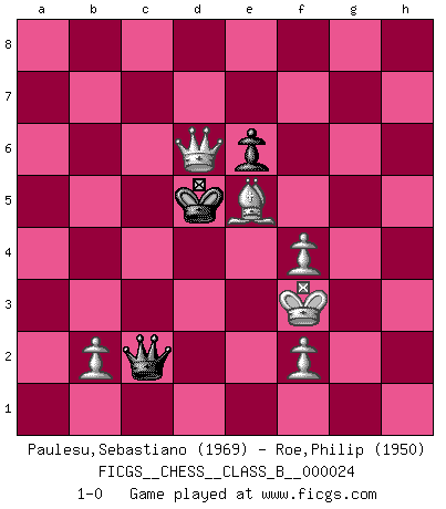 Last move : 1-0 2007 September 2 1:2:17 [Event "FICGS__CHESS__CLASS_B__000024"] [Site "FICGS"] [Date "2007.06.23"] [Round "1"] [White "Paulesu,Sebastiano"] [Black "Roe,Philip"] [Result "1-0"] [WhiteElo "1969"] [BlackElo "1950"] 1.e4 c6 2.d4 d5 3.Nc3 dxe4 4.Nxe4 Nf6 5.Nxf6+ gxf6 6.c3 Bf5 7.Nf3 e6 8.g3 Na6 9.Bg2 Qd7 10.Be3 Nc7 11.Nh4 Bg6 12.Qe2 Be7 13.O-O f5 14.Rfd1 O-O 15.c4 Rfd8 16.Nxg6 hxg6 17.Rac1 Bf6 18.h4 Qe7 19.Rc3 e5 20.dxe5 Qxe5 21.Rb3 Ne6 22.Rxb7 Nc5 23.Rxd8+ Bxd8 24.Rb5 cxb5 25.Bxa8 bxc4 26.Qxc4 Ne6 27.Bd5 f4 28.gxf4 Qf5 29.Qe4 Qg4+ 30.Qg2 Qd1+ 31.Kh2 Qh5 32.Bxe6 fxe6 33.Qh3 Kf7 34.Bxa7 Qa5 35.Bd4 Qxa2 36.h5 Qd5 37.hxg6+ Kxg6 38.Qh8 Kf7 39.Qe5 Qf3 40.Qg7+ Ke8 41.Qg6+ Kd7 42.Qf7+ Kd6 43.Be5+ Kc5 44.Qf8+ Kc4 45.Qxd8 Qh5+ 46.Kg3 Qg6+ 47.Kf3 Qc2 48.Qc7+ Kd5 49.Qd6+ 1-0 Caro-Kann : Bronstein-Larsen variation Kingside Castling by player White (move 13) Kingside Castling by player Black (move 14) 10 pieces endgame at move 37 : White KQBPPP , Black KQBP WHITE : King + 1 Queen 1 Bishop 3 Pawns BLACK : King + 1 Queen 1 Bishop 1 Pawn 9 pieces endgame at move 45 : White KQBPPP , Black KQP WHITE : King + 1 Queen 1 Bishop 3 Pawns BLACK : King + 1 Queen 1 Pawn Player White won this chess game. Follow this game move after move (download)The only thing Chess players have in common is Chess. (Lodewijk Prins) Garry Kasparov war erst in der Großmeister-Organisation GMA, dann in der Profischach-Vereinigung PCA, zum Schluss kehrte er wieder in den Schoß der FIDE zurück. Aber gut, manche Leute sind flexibel (Viswanathan Anand) Ciertamente, de todas la drogas del mundo, el Ajedrez debe ser el mas placentero permamentemente. (Assiac) Soyez une menace à chaque fois que vous vous asseyez pour jouer. (Ken Smith) A shortcut is the longest distance between two points. (Don Groves)