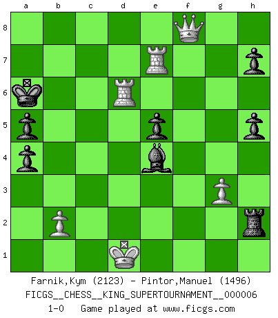 Last move : 1-0 2019 September 18 13:45:12 [Event "FICGS__CHESS__KING_SUPERTOURNAMENT__000006"] [Site "FICGS"] [Date "2019.09.02"] [Round "1"] [White "Farnik,Kym"] [Black "Pintor,Manuel"] [Result "1-0"] [WhiteElo "2123"] [BlackElo "1496"] 1.e4 e5 2.f4 Nc6 3.Nf3 Bc5 4.Nxe5 Nxe5 5.d4 Bb6 6.dxe5 d6 7.a4 a5 8.Nc3 Nh6 9.f5 dxe5 10.Qxd8+ Kxd8 11.Nd5 Bc5 12.Bg5+ f6 13.Bxh6 gxh6 14.O-O-O Bd6 15.Nxf6 b6 16.Bc4 Bb7 17.Rhf1 Ke7 18.Ng4 h5 19.Nh6 Bxe4 20.f6+ Kf8 21.Nf7 Rg8 22.Nxd6 cxd6 23.Bxg8 Kxg8 24.Rxd6 Kf7 25.g3 Rc8 26.Rd7+ Ke6 27.Re7+ Kd6 28.Rd1+ Kc6 29.Re6+ Kb7 30.Rd7+ Ka6 31.R6e7 Rxc2+ 32.Kd1 b5 33.f7 bxa4 34.f8Q Rxh2 35.Rd6+ 1-0 King's gambit Queenside Castling by player White (move 14) Promotion Queen by player White (move 34) Player White won this chess game. Follow this game move after move (download)Morphy was probably the greatest genius of them all. (Bobby Fischer) Wie gewinnt Tal? Er entwickelt alle seine Figuren in die Brettmitte und opfert sie dann irgendwo. (Robert James Fischer) Un sacrificio se refuta mucho mejor al aceptarlo. (Wilhelm Steinitz) La vie est comme un jeu d'échecs : nous esquissons un plan, mais celui-ci est tributaire de ce que daignent faire l'adversaire aux échecs et le destin dans la vie. (Arthur Schopenhauer) I don't know, I don't care, and it doesn't make any difference. (Albert Einstein)