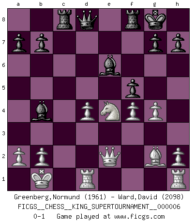 Last move : 0-1 2019 November 9 7:57:44 [Event "FICGS__CHESS__KING_SUPERTOURNAMENT__000006"] [Site "FICGS"] [Date "2019.09.02"] [Round "1"] [White "Greenberg,Normund"] [Black "Ward,David"] [Result "0-1"] [WhiteElo "1961"] [BlackElo "2098"] 1.e4 e5 2.f4 d5 3.exd5 e4 4.Nc3 Nf6 5.Qe2 Be7 6.Nxe4 Nxd5 7.d4 O-O 8.Nf3 c5 9.c3 Nc6 10.Bd2 cxd4 11.Nxd4 Nxd4 12.cxd4 Nb4 13.O-O-O Bf5 14.Bxb4 Bxb4 15.g4 Rc8+ 16.Kb1 Be6 17.Bg2 f5 0-1 This chess game has been lost on time (started : 2019.09.02 1:48:4) KGD : Falkbeer, Rubinstein variation Kingside Castling by player Black (move 7) Queenside Castling by player White (move 13) Player Black won this chess game. Follow this game move after move (download)Botvinnik tried to take the mystery out of Chess, always relating it to situations in ordinary life. He used to call Chess a typical inexact problem similar to those which people are always having to solve in everyday life. (Garry Kasparov) Du weisst es gibt ein Problem mit Computern und Fernschach, wenn jeder eine Rating von 2450 hat. (John Christen Knudsen) Diferente gente reacciona diferentemente en aceptar la derrota. (Bobby Fischer) Assurément je connaissais par expérience le mystérieux attrait de ce jeu royal, le seul entre tous les jeux inventés par les hommes qui échappe souverainement à la tyrannie du hasard, le seul où l'on ne doive sa victoire qu'à son intelligence ou plutôt à une certaine forme d'intelligence. Mais n'est-ce pas déjà le limiter injurieusement que d'appeler les échecs un jeu ? N'est-ce pas une science, un art ou quelque chose qui, comme le cercueil de Mahomet entre ciel et terre, est suspendu entre l'un et l'autre, et qui réunit un nombre incroyable de contraires ? [...] C'est une pensée qui ne mène à rien, une mathématique qui n'établit rien, un art qui ne laisse pas d'uvre, une architecture sans matière; et il l'a prouvé néanmoins qu'il était plus durable, à sa manière, que les livres ou que tout autre monument, ce jeu unique qui appartient à tous les peuples et à tous les temps, et dont personne ne sait quel dieu en fit don à la terre pour tuer l'ennui, pour aiguiser l'esprit et stimuler l'âme. Où commence-t-il, où finit-il ? (Stefan Zweig) Good luck. You're gonna need it. (Han Solo in Star Wars ep.6)