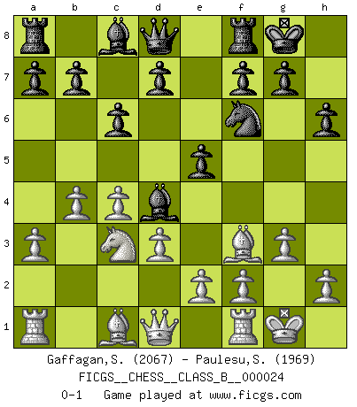 Last move : 0-1 2007 September 17 20:49:12 [Event "FICGS__CHESS__CLASS_B__000024"] [Site "FICGS"] [Date "2007.06.23"] [Round "1"] [White "Gaffagan,Steven"] [Black "Paulesu,Sebastiano"] [Result "0-1"] [WhiteElo "2067"] [BlackElo "1969"] 1.c4 Nf6 2.Nc3 e5 3.Nf3 Nc6 4.g3 Nd4 5.Bg2 Nxf3+ 6.Bxf3 Bc5 7.O-O O-O 8.d3 h6 9.a3 c6 10.b4 Bd4 0-1 This chess game has been lost on time (started : 2007.06.23 2:55:6) English Opening Kingside Castling by player White (move 7) Kingside Castling by player Black (move 7) Player Black won this chess game. Follow this game move after move (download)Of Chess it has been said that life is not long enough for it, but that is the fault of life, not Chess. (William Ewart Napier) Im Schach gewinnt jeder. Hat man Freunde am Spiel - und das ist die Hauptsache - ist auch der Verlust einer Partie kein Unglück. (David Bronstein) ¿Esta Bobby Fischer algo cuerdo?. (Salo Flohr) Aux échecs, l'amour-propre est satisfait quand on remporte la victoire, mais il n'y a pas de honte à être battu. (Benjamin Franklin) Difficult things take a long time, impossible things a little longer. (Author unknown)