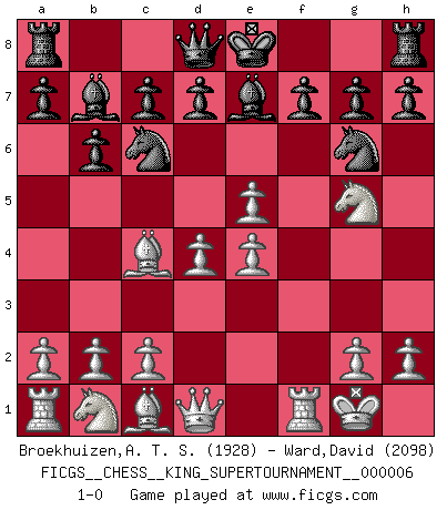 Last move : 1-0 2019 October 6 21:43:55 [Event "FICGS__CHESS__KING_SUPERTOURNAMENT__000006"] [Site "FICGS"] [Date "2019.09.02"] [Round "1"] [White "Broekhuizen,A. T. S."] [Black "Ward,David"] [Result "1-0"] [WhiteElo "1928"] [BlackElo "2098"] 1.e4 e5 2.f4 Ne7 3.fxe5 Ng6 4.Nf3 Nc6 5.d4 Be7 6.Bc4 b6 7.O-O Bb7 8.Ng5 1-0 King's gambit Kingside Castling by player White (move 7) Player White won this chess game. Follow this game move after move (download)A thorough understanding of the typical mating continuations makes the most complicated sacrificial combinations leading up to them not only not difficult, but almost a matter of course. (Siegbert Tarrasch) Im Internet Chess Club betrug mein Rating vorübergehend 3350 ELO-Punkte. (Sergej Karjakin) De eso se trata el Ajedrez. Un día le das una lección a tu oponente y al día siguiente el te da una a tí. (Bobby Fischer) Ne tendez aucun piège pour le plaisir ! Ne jouez rien dans l'espoir que l'adversaire réagisse de façon stupide ! Prenez toujours pour acquis que l'adversaire va trouver le meilleur coup ! Ne jouez jamais de coup dans l'espoir que l'adversaire ne voie pas la menace ! Chacun de vos coups doit améliorer la position d'une façon ou d'une autre. Is not life a hundred times too short to bore ourselves ? (Friedrich Nietzsche)