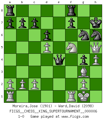Last move : 1-0 2019 October 14 0:38:39 [Event "FICGS__CHESS__KING_SUPERTOURNAMENT__000006"] [Site "FICGS"] [Date "2019.09.02"] [Round "1"] [White "Moreira,Jose"] [Black "Ward,David"] [Result "1-0"] [WhiteElo "1901"] [BlackElo "2098"] 1.e4 e5 2.f4 exf4 3.Nf3 d6 4.d4 g5 5.Nc3 Nc6 6.d5 Ne5 7.Bb5+ Bd7 8.Bxd7+ Nxd7 9.h4 g4 10.Nd4 h5 11.Bxf4 Bh6 12.Bg3 Bg7 13.Qd2 Ne7 14.Qf2 Ne5 15.O-O O-O 16.Nf5 N5g6 17.Nxg7 Kxg7 18.Qf6+ Kh7 19.Ne2 Ng8 20.Qf5 Nh6 21.Qxh5 Qe7 22.Nd4 Qxe4 23.Nf5 1-0 KGA : Fischer defense Kingside Castling by player White (move 15) Kingside Castling by player Black (move 15) Player White won this chess game. Follow this game move after move (download)If a ruler does not understand Chess, how can he rule over a kingdom ? (King Khusros II) Kleine Schachspieler machen Mist, und große Schachspieler machen Mist, aber große machen weniger Mist. (Fritz Sämisch) El Ajedrez es 99 por ciento táctica. (Teichmann) Il vaut toujours mieux jouer un plan faux de façon logique que de n'avoir pas de plan du tout. (Victor Kortchnoï) The absolute truth is the thing that makes people laugh. (Carl Reiner)