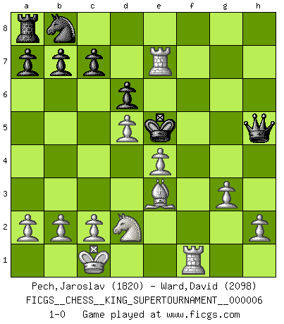 Last move : 1-0 2019 December 6 13:53:23 [Event "FICGS__CHESS__KING_SUPERTOURNAMENT__000006"] [Site "FICGS"] [Date "2019.09.02"] [Round "1"] [White "Pech,Jaroslav"] [Black "Ward,David"] [Result "1-0"] [WhiteElo "1820"] [BlackElo "2098"] 1.e4 e5 2.f4 d6 3.Nf3 exf4 4.Bc4 h6 5.d4 g5 6.g3 g4 7.Nh4 f3 8.Be3 Be7 9.Nxf3 gxf3 10.Qxf3 Qd7 11.Qxf7+ Kd8 12.Rf1 Qg4 13.Rf4 Qg5 14.Rf3 Qg4 15.Nd2 Nf6 16.Rxf6 Rf8 17.Qxf8+ Bxf8 18.Rxf8+ Ke7 19.Rg8 Qh3 20.O-O-O Be6 21.Rg7+ Kf6 22.Bxe6 Qxe6 23.Bxh6 Qe8 24.Rf1+ Ke6 25.d5+ Ke5 26.Be3 Qh5 27.Re7+ 1-0 King's gambit Queenside Castling by player White (move 20) Player White won this chess game. Follow this game move after move (download)Spassky will not be psyched out by Fischer. (Mike Goodall) Wenn ich Weiß habe gewinne ich weil ich Weiß habe, wenn ich Schwarz habe gewinne ich weil ich Bogoljubov bin. (Efim Bogoljubov) El Ajedrez es de 30 a 40 por ciento psicología. Uno no cuenta con esto cuando se juega contra una computadora. No lo puedo confundir. (Judith Polgar) On entre au jeu d'Echecs comme on entre en Religion. Pour le joueur d'Echecs, la partie d'Echecs c'est l'office, la messe, le défilé du 1er Mai, le dépôt de gerbe au Monument aux Morts. C'est un drame sacré. (Michel Roos) Internal peace cannot coexist with external war. (Don Groves)