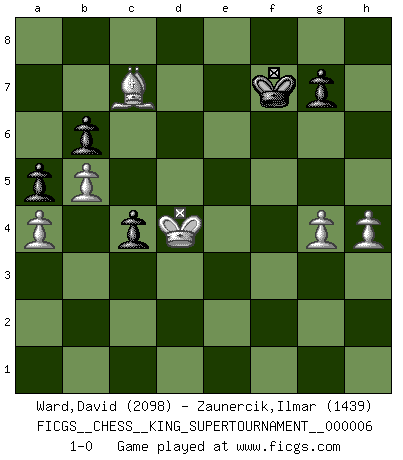 Last move : 1-0 2019 November 25 7:30:25 [Event "FICGS__CHESS__KING_SUPERTOURNAMENT__000006"] [Site "FICGS"] [Date "2019.09.02"] [Round "1"] [White "Ward,David"] [Black "Zaunercik,Ilmar"] [Result "1-0"] [WhiteElo "2098"] [BlackElo "1439"] 1.e4 e5 2.f4 exf4 3.Nf3 Bc5 4.d4 Bb6 5.Bxf4 d6 6.Bc4 Bg4 7.O-O Nc6 8.Bxf7+ Kxf7 9.Ng5+ Ke8 10.Qxg4 Nxd4 11.Kh1 Nf6 12.Qd1 h6 13.Nf3 Ne6 14.Bd2 Rf8 15.Nc3 Qd7 16.a4 a6 17.b4 Ng4 18.Qe2 Nd4 19.Nxd4 Bxd4 20.Rxf8+ Kxf8 21.Rf1+ Nf6 22.Nd5 Re8 23.c3 Be5 24.Bxh6 Kg8 25.Nxf6+ Bxf6 26.Qc4+ Qf7 27.Qxf7+ Kxf7 28.Bd2 Rxe4 29.Re1 Rc4 30.Rf1 d5 31.Rf3 d4 32.cxd4 Ke6 33.h3 Rxd4 34.Re3+ Be5 35.Bc3 Rd1+ 36.Re1 Rxe1+ 37.Bxe1 Bf4 38.g3 Be5 39.Kg2 b6 40.Kf3 Kf5 41.g4+ Kg6 42.h4 c5 43.Ke4 Bd4 44.b5 a5 45.Bd2 Bb2 46.Kd5 Bd4 47.Bf4 Kf7 48.Bc7 c4 49.Kxd4 1-0 King's knight's gambit Kingside Castling by player White (move 7) Player White won this chess game. Follow this game move after move (download)Fischer prefers to enter Chess history alone. (Miguel Najdorf) Das Spiel gibt uns die Genugtuung, die das Leben uns versagt. (Emanuel Lasker) De todos mis libros Rusos, la defensa contiene y difunde el 'calor' mas grande que pudiese verse extraño al observar lo supremamente abstracto que el Ajedrez supuestamente es. (Vladimir Nabokov) Aidez vos pièces, elles vous aideront. (Paul Morphy) Whenever people agree with me, I always feel I must be wrong. (Oscar Wilde)