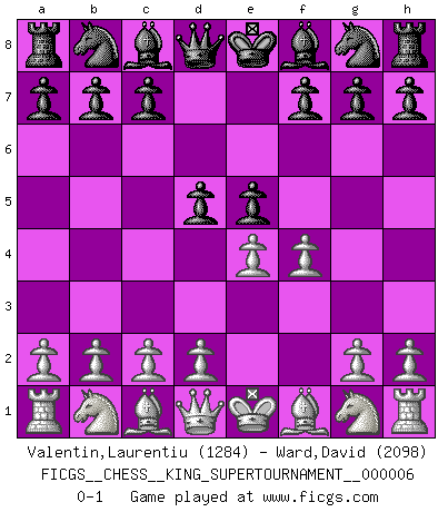 Last move : 0-1 2019 October 4 2:10:26 [Event "FICGS__CHESS__KING_SUPERTOURNAMENT__000006"] [Site "FICGS"] [Date "2019.09.02"] [Round "1"] [White "Valentin,Laurentiu"] [Black "Ward,David"] [Result "0-1"] [WhiteElo "1284"] [BlackElo "2098"] 1.e4 e5 2.f4 d5 0-1 This chess game has been lost on time (started : 2019.09.02 1:48:4) KGD : Falkbeer counter-gambit Player Black won this chess game. Follow this game move after move (download)What would Chess be without silly mistakes ? (Kurt Richter) Ich brauche nur einen Blick auf das Schachbrett zu werfen, und weiß schon, was in der Stellung steckt, was geschehen kann und was geschehen wird. Alle übrigen suchen und prüfen, ich aber weiß es! (José Raúl Capablanca) Morphy probablemente fue el genio más grande de todos. (Bobby Fischer) Vous n'êtes pas toujours obligé de jouer le meilleur coup. Un coup doit être actif, entreprenant, correct et beau ! (David Bronstein) Creativity is allowing yourself to make mistakes. Art is knowing which ones to keep. (Scott Adams)