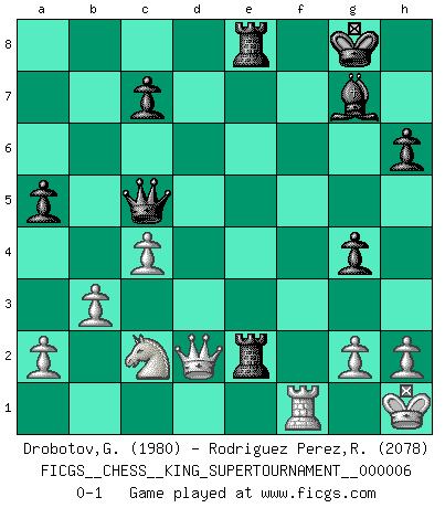 Last move : 0-1 2019 October 10 6:47:10 [Event "FICGS__CHESS__KING_SUPERTOURNAMENT__000006"] [Site "FICGS"] [Date "2019.09.02"] [Round "1"] [White "Drobotov,Gennady"] [Black "Rodriguez Perez,Rene"] [Result "0-1"] [WhiteElo "1980"] [BlackElo "2078"] 1.e4 e5 2.f4 exf4 3.Nf3 g5 4.Bc4 Bg7 5.O-O h6 6.Nc3 Nc6 7.d4 d6 8.Bb5 a6 9.Bxc6+ bxc6 10.Qd3 Ne7 11.b3 a5 12.Na4 O-O 13.Ba3 Ng6 14.c4 g4 15.Ne1 Qg5 16.Nc3 Re8 17.Nc2 f5 18.Rad1 fxe4 19.Nxe4 Qh5 20.Bxd6 Bf5 21.Bxf4 Bxe4 22.Qd2 Nxf4 23.Rxf4 c5 24.Rdf1 cxd4 25.Qd1 d3 26.Rxe4 Rxe4 27.Qxd3 Qc5+ 28.Kh1 Rae8 29.Qd2 Re2 0-1 KGA : Hanstein gambit Kingside Castling by player White (move 5) Kingside Castling by player Black (move 12) Player Black won this chess game. Follow this game move after move (download)That's what Chess is all about. One day you give your opponent a lesson, the next day he gives you one. (Bobby Fischer) Taktik ist was man tun muß, wenn etwas zu tun ist. Strategie ist was man tun muß, wenn nichts zu tun ist. (Savielly Grigorievitsch Tartakower) Peones: ellos son el alma de esta partida, solos forman el ataque y la defensa. (Philidor) Il a essayé de se convaincre qu'il pourrait empêcher toutes les erreurs et ne jamais perdre. L'horreur ! Gary Kasparov au sujet de Robert Fischer. Without enthusiasm, virtue functions not at all, and vice only poorly. (Mignon McLaughlin, The Neurotic's Notebook, 1960)