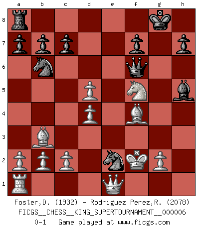 Last move : 0-1 2019 November 25 13:23:46 [Event "FICGS__CHESS__KING_SUPERTOURNAMENT__000006"] [Site "FICGS"] [Date "2019.09.02"] [Round "1"] [White "Foster,Duncan"] [Black "Rodriguez Perez,Rene"] [Result "0-1"] [WhiteElo "1932"] [BlackElo "2078"] 1.e4 e5 2.f4 exf4 3.Nf3 g5 4.h4 g4 5.Ne5 Nf6 6.Bc4 d5 7.exd5 Bd6 8.d4 Nh5 9.O-O O-O 10.Nxg4 Qxh4 11.Nh2 Nd7 12.Nf3 Qg4 13.Nh2 Qg5 14.Nf3 Qg7 15.Nc3 Ng3 16.Nb5 Nb6 17.Bb3 Re8 18.Re1 Bg4 19.Nxd6 Rxe1+ 20.Qxe1 Bxf3 21.Kf2 Bh5 22.Bxf4 Ne2 23.Nf5 Qf6 0-1 KGA : Kieseritsky, Berlin defense, 6.Bc4 Kingside Castling by player White (move 9) Kingside Castling by player Black (move 9) Player Black won this chess game. Follow this game move after move (download)I'm not afraid of Spassky. The world knows I'm the best. You don't need a match to prove it. (Bobby Fischer) Zeige mir drei Eröffnungsvarianten und ich beweise dir, dass zwei davon inkorrekt sind. (Emanuel Lasker) Puntos débiles o agujeros en la posición de tu oponente deben de ser ocupados por piezas, no Peones. (Siegbert Tarrasch) La vie et les Echecs sont tous les deux une lutte constante. (Lasker) Perseverance does not equal worthiness. Next time you want to get my attention, wear something fun. Low-riding jeans are hot. (Gregory House, House M.D.)