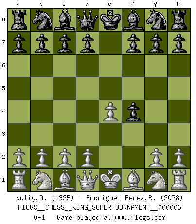 Last move : 0-1 2019 September 2 12:47:40 [Event "FICGS__CHESS__KING_SUPERTOURNAMENT__000006"] [Site "FICGS"] [Date "2019.09.02"] [Round "1"] [White "Kuliy,Oleksandr"] [Black "Rodriguez Perez,Rene"] [Result "0-1"] [WhiteElo "1925"] [BlackElo "2078"] 1.e4 e5 2.f4 exf4 0-1 King's gambit accepted Player Black won this chess game. Follow this game move after move (download)In Chess, just as in life, today's bliss may be tomorrow's poison. (Assaic) Es gibt keine einzige Frau, der ich nicht einen Springer vorgeben könnte und trotzdem gewänne. (Robert James Fischer) La táctica fluye a partir de una posición superior. (Bobby Fischer) Lorsque vous vous retrouvez devant une position atroce, ne tendez pas un ultime piège dérisoire avec l'intention d'abandonner si l'adversaire le déjoue ! Faites-vous plutôt un devoir de résister comme si votre vie en dépendait. Jouez le coup qui vous déplairait au centuple si vous étiez dans la peau de votre tortionnaire ! The only sure thing about luck is that it will change. (Wilson Mizner)