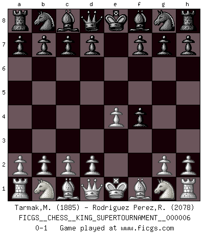 Last move : 0-1 2019 October 2 12:52:30 [Event "FICGS__CHESS__KING_SUPERTOURNAMENT__000006"] [Site "FICGS"] [Date "2019.09.02"] [Round "1"] [White "Tarmak,Mart"] [Black "Rodriguez Perez,Rene"] [Result "0-1"] [WhiteElo "1885"] [BlackElo "2078"] 1.e4 e5 2.f4 exf4 0-1 This chess game has been lost on time (started : 2019.09.02 1:48:4) King's gambit accepted Player Black won this chess game. Follow this game move after move (download)I still hope to kill Fischer. (Boris Spassky) Schach ist gnadenlos. Du mußt bereit sein zu töten. (Nigel Short) Después de la respuesta de las negras a 1.e4 con 1..e5, se quedan siempre tratando de entrar dentro del juego. (Howard Staunton) Dans le domaine de la peinture, de la gravure et de la sculpture, dès la première décennie de notre siècle, les artistes abandonnent la représentation de la partie d'échecs pour se concentrer sur les pièces, sur les échiquiers et sur toutes les variations auxquelles les unes et les autres peuvent donner lieu. On passe en quelque sorte d'un thème social à un thème musical (au sens de la musica médiévale, c'est-à-dire d'une notion qui inclue le rythme, l'harmonie, la construction et la déconstruction, etc.). Graphiquement et picturalement, l'échiquier apparaît comme une structure ouverte, dynamique, d'une richesse infinie, autorisant toutes les combinatoires et débouchant sur des mouvements et des rythmes de nature exponentielle. (Michel Pastoureau) Unless in communicating with it one says exactly what one means, trouble is bound to result. (Alan Turing, about computers)
