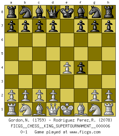 Last move : 0-1 2019 October 2 12:52:30 [Event "FICGS__CHESS__KING_SUPERTOURNAMENT__000006"] [Site "FICGS"] [Date "2019.09.02"] [Round "1"] [White "Gordon,Nicholas"] [Black "Rodriguez Perez,Rene"] [Result "0-1"] [WhiteElo "1759"] [BlackElo "2078"] 1.e4 e5 2.f4 exf4 0-1 This chess game has been lost on time (started : 2019.09.02 1:48:4) King's gambit accepted Player Black won this chess game. Follow this game move after move (download)The defensive power of a pinned piece is only imaginary. (Aaron Nimzovich) Es ist nicht das erste mal, dass sich die FIDE dem Arabischen Geld gebeugt hat (über die FIDE WM 2004 in Lybien). (Larry Evans) Muchos jugadores de Ajedrez se sorprendían cuando después de la partida, Fischer explicaba con calma: 'Yo ya había analizado esta posibilidad' en una posición en la cual yo creía que no era posible de prever desde la apertura. (Mikhail Tal) Ce n'est pas pour s'amuser qu'il joue aux échecs : il célèbre un culte. (Vladimir Nabokov) Wisdom doesn't necessarily come with age. Sometimes age just shows up all by itself. (Tom Watson)