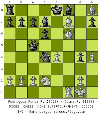 Last move : 1-0 2019 November 2 19:34:13 [Event "FICGS__CHESS__KING_SUPERTOURNAMENT__000006"] [Site "FICGS"] [Date "2019.09.02"] [Round "1"] [White "Rodriguez Perez,Rene"] [Black "Csoma,Robert"] [Result "1-0"] [WhiteElo "2078"] [BlackElo "1688"] 1.e4 e5 2.f4 exf4 3.Nf3 d6 4.Bc4 g5 5.h4 g4 6.Ng5 Nh6 7.d4 f6 8.Bxf4 fxg5 9.Bxg5 Qd7 10.O-O Nc6 11.Qd2 Qg7 12.Bf6 Qg6 13.Bxh8 Bd7 14.Rf6 Qh5 15.Qf4 Ke7 16.Nd2 Nxd4 17.Rf1 Qc5 18.Rf7+ Nxf7 19.Qf6+ Ke8 20.Bxf7+ 1-0 KGA : Fischer defense Kingside Castling by player White (move 10) Player White won this chess game. Follow this game move after move (download)The way he plays Chess demonstrates a man's whole nature. (Stanley Ellin) Konzentriere dich auf materielle Gewinne. Nimm, was dir dein Gegner gibt, ausser es gibt einen guten Grund der dagegenspricht. (Robert James Fischer) El jugador de combinación piensa hacia adelante; comienza de la posición dada y trabaja las movidas contundentes en su mente. (Emanuel Lasker) Le succès, c'est être capable d'aller d'échec en échec sans perdre son enthousiasme. (Winston Churchill) You know what they say : You lie down with the Devil, you wake up in Hell. (Horatio Caine, C.S.I. Miami)