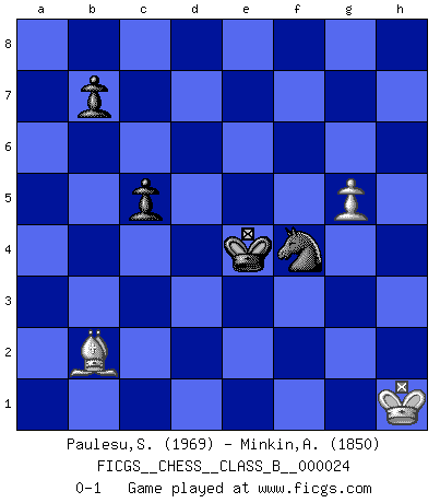 Last move : 0-1 2007 October 21 15:1:30 [Event "FICGS__CHESS__CLASS_B__000024"] [Site "FICGS"] [Date "2007.06.23"] [Round "1"] [White "Paulesu,Sebastiano"] [Black "Minkin,Alexander"] [Result "0-1"] [WhiteElo "1969"] [BlackElo "1850"] 1.e4 c6 2.d4 d5 3.Nc3 dxe4 4.f3 exf3 5.Nxf3 Bf5 6.Bc4 e6 7.O-O Nf6 8.Ng5 g6 9.Qe2 Qxd4+ 10.Be3 Qe5 11.Nf3 Qa5 12.h3 h5 13.a3 Nbd7 14.b4 Qc7 15.Rad1 Bd6 16.Kh1 O-O 17.Qd2 Nd5 18.Bxd5 exd5 19.Nd4 Be6 20.Ne4 dxe4 21.Nxe6 fxe6 22.Rxf8+ Kxf8 23.Qxd6+ Qxd6 24.Rxd6 Ke7 25.Rd4 Nf6 26.Bg5 e5 27.Rxe4 Ke6 28.Re3 Nd5 29.Rg3 Kf5 30.Bh4 a5 31.Rg5+ Ke4 32.Rxg6 Ne3 33.Re6 Kd5 34.Rh6 axb4 35.axb4 Nxc2 36.Be7 Re8 37.Rd6+ Kc4 38.Re6 Nxb4 39.Rxe5 Nd5 40.Bd6 Rxe5 41.Bxe5 Kd3 42.g4 hxg4 43.hxg4 Ke4 44.Bb2 c5 45.g5 Nf4 0-1 Caro-Kann : Rasa-Studier gambit Kingside Castling by player White (move 7) Kingside Castling by player Black (move 16) 10 pieces endgame at move 40 : White KBPP , Black KRNPPP WHITE : King + 1 Bishop 2 Pawns BLACK : King + 1 Rook 1 Knight 3 Pawns 9 pieces endgame at move 41 : White KBPP , Black KNPPP WHITE : King + 1 Bishop 2 Pawns BLACK : King + 1 Knight 3 Pawns 8 pieces endgame at move 42 : White KBP , Black KNPPP WHITE : King + 1 Bishop 1 Pawn BLACK : King + 1 Knight 3 Pawns 7 pieces endgame at move 43 : White KBP , Black KNPP WHITE : King + 1 Bishop 1 Pawn BLACK : King + 1 Knight 2 Pawns Player Black won this chess game. Follow this game move after move (download)I like the moment when I break a man's ego. (Bobby Fischer) Ich würde mich als ganz normalen Jungen bezeichnen [Im Alter von 12]. (Sergej Karjakin) Cuando tengas duda... ¡juega al Ajedrez!. (Tevis) La vie est comme un jeu d'échecs : nous esquissons un plan, mais celui-ci est tributaire de ce que daignent faire l'adversaire aux échecs et le destin dans la vie. (Arthur Schopenhauer) We need strong personalities and only one world champion to attract sponsors. (Anatoly Karpov)