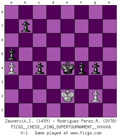 Last move : 0-1 2019 November 9 22:58:13 [Event "FICGS__CHESS__KING_SUPERTOURNAMENT__000006"] [Site "FICGS"] [Date "2019.09.02"] [Round "1"] [White "Zaunercik,Ilmar"] [Black "Rodriguez Perez,Rene"] [Result "0-1"] [WhiteElo "1439"] [BlackElo "2078"] 1.e4 e5 2.f4 exf4 3.Nf3 g5 4.h3 h6 5.d4 Bg7 6.Nc3 d6 7.Bc4 Nc6 8.Qd3 Nf6 9.Bd2 Nb4 10.Bxf7+ Kf8 11.Qc4 Nxc2+ 12.Kf2 Nxa1 13.Bg6 Qe7 14.e5 dxe5 15.Nxe5 Be6 16.Qe2 Rd8 17.Rxa1 Rxd4 18.Kg1 Ne4 19.Nxe4 Bxe5 20.Bc3 Bc4 21.Qe1 Bf7 22.Bxf7 Kxf7 23.Bxd4 Bxd4+ 24.Kf1 Re8 25.Nf2 Qxe1+ 26.Rxe1 Rxe1+ 27.Kxe1 Bxb2 28.Ng4 h5 29.Nf2 Ke6 30.Ne4 Kf5 31.Nd2 Bc3 32.Ke2 Bxd2 33.Kxd2 g4 34.hxg4+ hxg4 35.Ke2 Ke4 36.a4 a5 37.Kf2 c5 38.Ke2 c4 0-1 King's knight's gambit 10 pieces endgame at move 34 : White KPPP , Black KPPPPP WHITE : King + 3 Pawns BLACK : King + 5 Pawns 9 pieces endgame at move 34 : White KPP , Black KPPPPP WHITE : King + 2 Pawns BLACK : King + 5 Pawns Player Black won this chess game. Follow this game move after move (download)Who is your opponent tonight, tonight I am playing against the Black pieces. (Akiba Rubinstein) Im Internet Chess Club betrug mein Rating vorübergehend 3350 ELO-Punkte. (Sergej Karjakin) El Peón aislado arroja penumbra sobre todo el tablero. (Aaron Nimzovich) J'apprécie les joueurs d'est-indienne, c'est grâce à eux que je nourris ma famille depuis tant d'années. (Petrosian) He who is a good ruler must first have been ruled. (Aristotle)