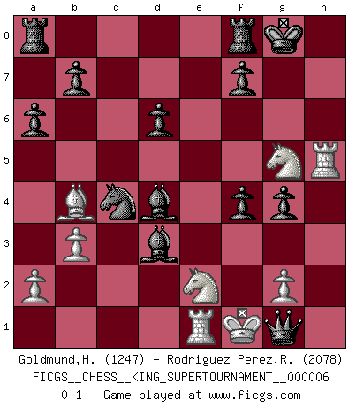 Last move : 0-1 2019 October 22 21:10:59 [Event "FICGS__CHESS__KING_SUPERTOURNAMENT__000006"] [Site "FICGS"] [Date "2019.09.02"] [Round "1"] [White "Goldmund,Heike"] [Black "Rodriguez Perez,Rene"] [Result "0-1"] [WhiteElo "1247"] [BlackElo "2078"] 1.e4 e5 2.f4 exf4 3.Nf3 g5 4.h3 h6 5.Nc3 Bg7 6.d4 a6 7.Bc4 d6 8.Bd2 Nf6 9.e5 Nh5 10.Qe2 Ng3 11.exd6 Nxe2 12.Nxe2 cxd6 13.Bc3 O-O 14.O-O Nc6 15.Rad1 Ne7 16.Kf2 Nf5 17.Rh1 Ne3 18.Rd3 Nxc4 19.h4 Bf5 20.R3d1 Qe7 21.hxg5 hxg5 22.Rh5 Qe3+ 23.Kf1 Bxc2 24.Re1 g4 25.Ng5 Bd3 26.Bb4 Bxd4 27.b3 Qg1+ 0-1 King's knight's gambit Kingside Castling by player Black (move 13) Kingside Castling by player White (move 14) Player Black won this chess game. Follow this game move after move (download)Chess holds its master in its own bonds, shackling the mind and brain so that the inner freedom of the very strongest must suffer. (Albert Einstein) Die größte Kunst beim Schach besteht darin dem Gegner nicht zu zeigen was er tun kann. (Garry Kasparov) Una clavada es mas poderosa que una espada. (Fred Reinfeld) Le jeu d'échecs est comme rejeté hors du temps. (Antoine de Saint-Exupéry) Philosophers use a language that is already deformed as though by shoes that are too tight. (Ludwig Wittgenstein)