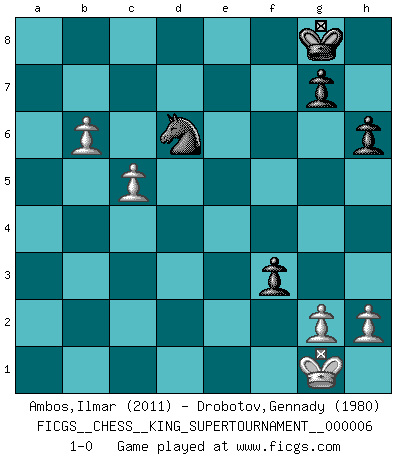 Last move : 1-0 2019 October 12 7:21:54 [Event "FICGS__CHESS__KING_SUPERTOURNAMENT__000006"] [Site "FICGS"] [Date "2019.09.02"] [Round "1"] [White "Ambos,Ilmar"] [Black "Drobotov,Gennady"] [Result "1-0"] [WhiteElo "2011"] [BlackElo "1980"] 1.e4 e5 2.f4 exf4 3.Nf3 d6 4.d4 Nf6 5.Nc3 Be7 6.Bxf4 O-O 7.Bc4 Nxe4 8.Nxe4 d5 9.Bd3 dxe4 10.Bxe4 Bd6 11.Bxd6 Qxd6 12.O-O f5 13.Bd3 Nc6 14.c3 Kh8 15.Qd2 Bd7 16.Rae1 Rae8 17.b4 a6 18.a4 Ne7 19.Ne5 Ng6 20.Nxd7 Rxe1 21.Nxf8 Rxf1+ 22.Kxf1 Qxf8 23.Qe3 c6 24.Qe6 Ne7 25.Qd7 b5 26.axb5 axb5 27.d5 cxd5 28.Bxb5 f4 29.Be2 Nf5 30.b5 Ne3+ 31.Kg1 Qb8 32.Qc6 Qd8 33.b6 Nf5 34.Bf3 h6 35.Bxd5 Kh7 36.c4 f3 37.Qe6 Nd6 38.Qg8+ Qxg8 39.Bxg8+ Kxg8 40.c5 1-0 KGA : Fischer defense Kingside Castling by player Black (move 6) Kingside Castling by player White (move 12) 10 pieces endgame at move 39 : White KPPPP , Black KNPPP WHITE : King + 4 Pawns BLACK : King + 1 Knight 3 Pawns Player White won this chess game. Follow this game move after move (download)A man that will take back a move at Chess will pick a pocket. (Richard Fenton) Ich liebe den Moment, wenn ich das Ego meines Gegenüber breche. (Robert James Fischer) El Ajedrez es de 30 a 40 por ciento psicología. Uno no cuenta con esto cuando se juega contra una computadora. No lo puedo confundir. (Judith Polgar) Que feriez-vous si vous étiez en train de jouer aux échecs et que la fin du monde arrive ? Je continuerais à jouer. (Saint Borromée) May I never be complete. May I never be content. May I never be perfect. Deliver me, Tyler, from being perfect and complete. (Chuck Palahniuk, Fight Club)