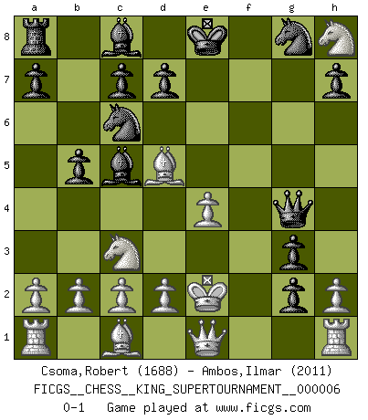 Last move : 0-1 2019 October 19 20:27:24 [Event "FICGS__CHESS__KING_SUPERTOURNAMENT__000006"] [Site "FICGS"] [Date "2019.09.02"] [Round "1"] [White "Csoma,Robert"] [Black "Ambos,Ilmar"] [Result "0-1"] [WhiteElo "1688"] [BlackElo "2011"] 1.e4 e5 2.f4 exf4 3.Nf3 g5 4.Bc4 g4 5.Ne5 Qh4+ 6.Kf1 Nc6 7.Nxf7 b5 8.Bd5 f3 9.Nc3 Bc5 10.Qe1 fxg2+ 11.Ke2 g3 12.Nxh8 Qg4+ 0-1 KGA : Herzfeld gambit Player Black won this chess game. Follow this game move after move (download)When your house is on fire, you can't be bothered with the neighbors. Or, as we say in Chess, if your King is under attack you don't worry about losing a Pawn on the Queen's side. (Gary Kasparov) Ich trinke, ich rauche, ich spiele, ich liebe Frauen aber Fernschach ist ein Laster, das ich nicht habe. (Mikhail Nekhemyevich Tal) Cuando tengas duda... ¡juega al Ajedrez!. (Tevis) Je crois qu'il existe des manières très spécifiques de jouer efficacement contre une machine. Evidemment, nous n'avons aucune chance en technique pure, parce que l'ordinateur calcule de manière parfaite. Mais lorsque nous faisons appel à notre cerveau, en utilisant l'intuition et la compréhension, alors nous restons beaucoup plus forts. (Anatoli Karpov) He who laughs last probably does not get the joke. (Unknown)