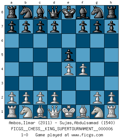 Last move : 1-0 2019 October 2 12:52:30 [Event "FICGS__CHESS__KING_SUPERTOURNAMENT__000006"] [Site "FICGS"] [Date "2019.09.02"] [Round "1"] [White "Ambos,Ilmar"] [Black "Sujas,Abdulsamad"] [Result "1-0"] [WhiteElo "2011"] [BlackElo "1540"] 1.e4 e5 2.f4 1-0 This chess game has been lost on time (started : 2019.09.02 1:48:4) King's gambit Player White won this chess game. Follow this game move after move (download)The laws of Chess do not permit a free choice: you have to move whether you like it or not. (Emanuel Lasker) Die Fehler sind da, Sie warten nur darauf gemacht zu werden. (Savielly Grigorievitsch Tartakower) Hay dos clases de hombres: aquellos que se conforman en dejarse llevar por las circunstancias y que juegan barajas y aquellos decididos a controlar las circunstancias y que juegan al Ajedrez. (Mortimer Collins) Soyez une menace à chaque fois que vous vous asseyez pour jouer. (Ken Smith) Chess is as much a mystery as women. (Purdy)