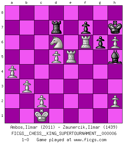 Last move : 1-0 2019 October 12 22:38:59 [Event "FICGS__CHESS__KING_SUPERTOURNAMENT__000006"] [Site "FICGS"] [Date "2019.09.02"] [Round "1"] [White "Ambos,Ilmar"] [Black "Zaunercik,Ilmar"] [Result "1-0"] [WhiteElo "2011"] [BlackElo "1439"] 1.e4 e5 2.f4 exf4 3.Nf3 Nc6 4.d4 d6 5.Bxf4 Bg4 6.Nc3 Nf6 7.Qd3 Nb4 8.Qb5+ Nc6 9.Qxb7 Bd7 10.O-O-O Rb8 11.Qa6 Be7 12.d5 Ne5 13.Nxe5 dxe5 14.Bxe5 O-O 15.Qxa7 Bd6 16.Bxd6 cxd6 17.Be2 Re8 18.Qd4 Qa5 19.a3 Rb7 20.Rd3 Re5 21.Rg3 Be8 22.Qe3 Nd7 23.Qh6 g6 24.Rh3 Nf8 25.Rf1 Qb6 26.b3 Qc5 27.Kb2 Ra7 28.a4 Rae7 29.g4 Qd4 30.Rd3 Qb6 31.Rdf3 Qd4 32.Qe3 Rxe4 33.Qxd4 Rxd4 34.Rf4 Rd2 35.R1f2 Nd7 36.Kc1 Rdxe2 37.Rxe2 Ne5 38.Rf6 Bd7 39.g5 Bg4 40.Re3 h6 41.gxh6 Rd7 42.Ne4 Kh7 43.Nxd6 Bh5 44.Rxe5 1-0 King's knight's gambit Queenside Castling by player White (move 10) Kingside Castling by player Black (move 14) Player White won this chess game. Follow this game move after move (download)Chess opens and enriches your mind. (Saudin Robovic) Zeige mir drei Eröffnungsvarianten und ich beweise dir, dass zwei davon inkorrekt sind. (Emanuel Lasker) El Ajedrez es realmente noventa y nueve por ciento calculación. (Soltis) C'est une question de caractère, Beaucoup de gens perdent leur motivation très vite. D'autres, ils sont rares, peuvent la conserver très longtemps. J'aime les échecs, encore aujourd'hui je suis heureux d'analyser des parties. J'aime toujours gagner, je déteste encore perdre. Bien jouer est important pour mon intégrité intellectuelle et morale. Et puis les échecs vivent en ce moment une période historique grâce à Internet. Ils se développent dans les systèmes éducatifs à travers le monde. Ils sortent de leur ghetto, et c'est mon rôle de mener à bien cette révolution. (Gary Kasparov) Man with more than one clock never knows what time it is. (Chinese thought)