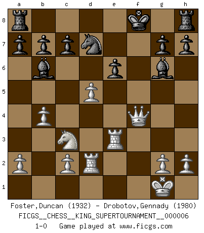 Last move : 1-0 2019 November 10 7:58:13 [Event "FICGS__CHESS__KING_SUPERTOURNAMENT__000006"] [Site "FICGS"] [Date "2019.09.02"] [Round "1"] [White "Foster,Duncan"] [Black "Drobotov,Gennady"] [Result "1-0"] [WhiteElo "1932"] [BlackElo "1980"] 1.e4 e5 2.f4 exf4 3.Nf3 d6 4.Bc4 Nc6 5.d4 Nf6 6.O-O Nxe4 7.Re1 d5 8.Nc3 dxc4 9.Rxe4+ Be7 10.d5 Nb8 11.Qe2 Bf5 12.Re5 Bg6 13.Bxf4 Nd7 14.Re3 Kf8 15.Nd4 Bc5 16.Qxc4 Qf6 17.Rd1 Bh5 18.b4 Bb6 19.R1d3 Bg6 20.Rd2 Qxf4 21.Ne6+ fxe6 22.Qxf4+ 1-0 KGA : Fischer defense Kingside Castling by player White (move 6) Player White won this chess game. Follow this game move after move (download)A thorough understanding of the typical mating continuations makes the most complicated sacrificial combinations leading up to them not only not difficult, but almost a matter of course. (Siegbert Tarrasch) Gewinnen beim Schach fördert das Selbstvertrauen. Beim Sex spüre ich sowas nicht... (Garry Kasparov) La caracteristica mas importante en la posición del Ajedrez es la actividad de las piezas. Esto es absolutamente fundamental en todas las fases del juego: Apertura, Juego Medio y especialmente Finales. La limitación primordial en la actividad de una pieza, es la estructuración de los Peones. (Michael Stean) La conception d'un plan est le processus par lequel un joueur exploite les avantages de sa position tout en s'efforçant d'en réduire au minimum les inconvénients. Afin de garantir le succès, un plan doit toujours se fonder sur un diagnostic objectif des particularités d'une position. La conception d'un plan est d'autant plus difficile que la position est équilibrée, et grandement facilitée lorsqu'il n'existe qu'un seul plan susceptible de répondre aux exigences de la position. (Harry Golombek) There are 10 types of people in this world: those who understand binary and those who don't. (Anonymous)