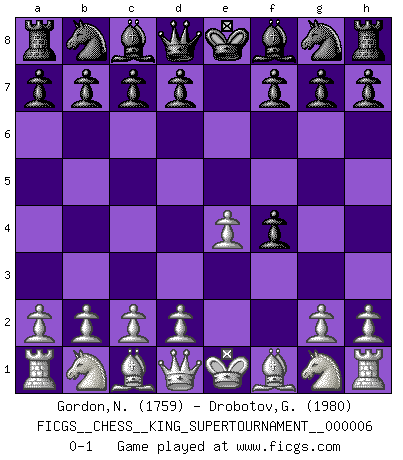 Last move : 0-1 2019 October 2 12:52:30 [Event "FICGS__CHESS__KING_SUPERTOURNAMENT__000006"] [Site "FICGS"] [Date "2019.09.02"] [Round "1"] [White "Gordon,Nicholas"] [Black "Drobotov,Gennady"] [Result "0-1"] [WhiteElo "1759"] [BlackElo "1980"] 1.e4 e5 2.f4 exf4 0-1 This chess game has been lost on time (started : 2019.09.02 1:48:4) King's gambit accepted Player Black won this chess game. Follow this game move after move (download)When you play Bobby, it is not a question if you win or lose. It is a question if you survive. (Boris Spassky) Mutter, ich bin eben Ex-Weltmeister geworden. --beim nach Hause Kommen nach dem Verlust des WM-Titels an Mihail Botvinnik -- (Mikhail Nekhemyevich Tal) No puedes jugar al Ajedrez si eres de corazón noble. (Proverbio Francés) Psychologiquement, tu dois avoir confiance en toi même, mais cette confiance doit être basée sur des faits. (Robert Fischer) All battles are fought by scared men who'd rather be someplace else. (John Wayne in the movie In harm's way)