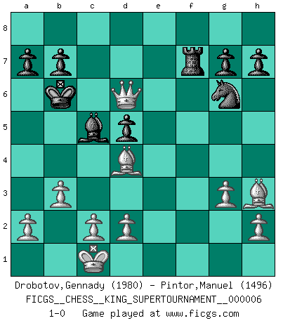 Last move : 1-0 2019 September 9 16:27:0 [Event "FICGS__CHESS__KING_SUPERTOURNAMENT__000006"] [Site "FICGS"] [Date "2019.09.02"] [Round "1"] [White "Drobotov,Gennady"] [Black "Pintor,Manuel"] [Result "1-0"] [WhiteElo "1980"] [BlackElo "1496"] 1.e4 e5 2.f4 Nc6 3.Nf3 Bc5 4.fxe5 Nxe5 5.Nxe5 Qh4+ 6.g3 Qxe4+ 7.Qe2 Qxh1 8.Ng6 Ne7 9.Nxh8 d5 10.Nc3 c6 11.b3 Be6 12.Bb2 O-O-O 13.Nxf7 Bxf7 14.O-O-O Ng6 15.Bh3+ Kc7 16.Rxh1 Re8 17.Nxd5+ cxd5 18.Qb5 Be7 19.Rf1 Rf8 20.Rxf7 Rxf7 21.Qd7+ Kb6 22.Bd4+ Bc5 23.Qd6+ 1-0 King's gambit Queenside Castling by player Black (move 12) Queenside Castling by player White (move 14) Player White won this chess game. Follow this game move after move (download)Fischer, who may or may not be mad as a hatter, has every right to be horrified. (Jeremy Silman) Ich war schon mal beim Dopingtest. Da musste ich Urin abgeben, während Dritte zusahen. (Elisabeth Pähtz) Fischer deseaba darle a los Rusos una sopa de su propia medicina. (Larry Evans) Nous sommes les pions de la mystérieuse partie d'Echecs jouée par Dieu. Il nous déplace, nous arrête, nous pousse encore, puis nous lance un à un dans la boîte du Néant. Epitaphe sur la tombe de David Janowsky (1868-1927). A computer lets you make more mistakes faster than any invention in human history - with the possible exceptions of handguns and tequila. (Mitch Ratcliffe)