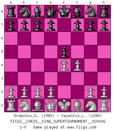 Last move : 1-0 2019 October 2 12:52:30 [Event "FICGS__CHESS__KING_SUPERTOURNAMENT__000006"] [Site "FICGS"] [Date "2019.09.02"] [Round "1"] [White "Drobotov,Gennady"] [Black "Valentin,Laurentiu"] [Result "1-0"] [WhiteElo "1980"] [BlackElo "1284"] 1.e4 e5 2.f4 1-0 This chess game has been lost on time (started : 2019.09.02 1:48:4) King's gambit Player White won this chess game. Follow this game move after move (download)The tactician must know what to do whenever something needs doing; the strategist must know what to do when nothing needs doing. (Savielly Tartakover) Oft bringt ein stiller Zug das Erdbeben. (Richard Reti) El Ajedrez por encima de todo... ¡es una pelea!. (Emanuel Lasker) Je ne suis pas le dernier à jouer lâchement des coups douteux pendant le zeïtnot de l'adversaire pour l'achever: en effet les coups qui font le plus peur sont ceux que l'on ne comprend pas. Je me fais souvent peur quand je joue. (Un professeur anonyme) Winning isn't everything... but losing is nothing. (Mednis)