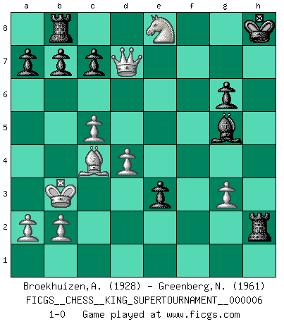 Last move : 1-0 2020 January 25 10:42:4 [Event "FICGS__CHESS__KING_SUPERTOURNAMENT__000006"] [Site "FICGS"] [Date "2019.09.02"] [Round "1"] [White "Broekhuizen,A. T. S."] [Black "Greenberg,Normund"] [Result "1-0"] [WhiteElo "1928"] [BlackElo "1961"] 1.e4 e5 2.f4 exf4 3.Nf3 Be7 4.h4 Nf6 5.e5 Nd5 6.d4 d6 7.c4 Ne3 8.Bxe3 fxe3 9.Nc3 Bg4 10.Qb3 Nd7 11.exd6 Bxd6 12.O-O-O O-O 13.c5 Bf4 14.Be2 Rb8 15.Qc2 g6 16.Qe4 Bxf3 17.Qxf3 Bh6 18.h5 Bg7 19.hxg6 fxg6 20.Bc4+ Kh8 21.Rxh7+ Kxh7 22.Rh1+ Bh6 23.Qh3 Qg5 24.Ne4 Qf4 25.Qxd7+ Kh8 26.g3 Qf1+ 27.Rxf1 Rxf1+ 28.Kc2 Rh1 29.Nf6 Rh2+ 30.Kb3 Bg5 31.Ne8 1-0 This chess game has been lost on time (started : 2019.09.02 1:48:4) KGA : Cunningham defense Queenside Castling by player White (move 12) Kingside Castling by player Black (move 12) Player White won this chess game. Follow this game move after move (download)I'd rather have a Pawn than a finger. (Reuben Fine) Ich erzeugte keinen Neid, da mich die Schachspieler als Musiker und die Musiker als Schachspieler betrachteten. (Mark Taimanov) Aquel que toma al Peón de Caballo de la Reina, se pasará la noche a dormir en la calle. (Anónimo) Tous ces prétendus hommes politiques sont les pions, les Cavaliers, les Tours ou les Fous d'une partie d'échecs qui se jouera tant qu'un hasard ne renversera pas l'échiquier. (Honoré de Balzac) Fortune favours the audacious. (Desiderius Erasmus)