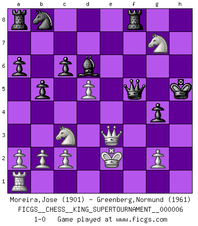 Last move : 1-0 2019 November 1 11:57:34 [Event "FICGS__CHESS__KING_SUPERTOURNAMENT__000006"] [Site "FICGS"] [Date "2019.09.02"] [Round "1"] [White "Moreira,Jose"] [Black "Greenberg,Normund"] [Result "1-0"] [WhiteElo "1901"] [BlackElo "1961"] 1.e4 e5 2.f4 exf4 3.Nf3 Be7 4.Bc4 Bh4+ 5.Kf1 Be7 6.Ne5 Nh6 7.d4 d6 8.Nf3 Bg4 9.h3 Be6 10.d5 Bd7 11.Nc3 a6 12.Bxf4 g5 13.Be3 b5 14.Bd3 c6 15.Qd2 f6 16.h4 Ng4 17.hxg5 Nxe3+ 18.Qxe3 fxg5 19.e5 Bg4 20.Rh6 O-O 21.Bxh7+ Kg7 22.exd6 Bxd6 23.Qd3 Bf5 24.Bxf5 Kxh6 25.Nd4 g4 26.Ne6 Qf6 27.Qe3+ Kh5 28.Ke2 Qxf5 29.Ng7+ 1-0 This chess game has been lost on time (started : 2019.09.02 1:48:4) KGA : Cunningham defense Kingside Castling by player Black (move 20) Player White won this chess game. Follow this game move after move (download)Alekhine is a poet who creates a work of art out of something that would hardly inspire another man to send home a picture post card. (Max Euwe) Ich spiele 70 Eröffnungssysteme. (Viktor Kortschnoi) El Ajedrez, como la música, como el amor, tiene el poder de hacer feliz a la gente. (Siegbert Tarrasch) Tout change constamment, y compris dans le monde des Echecs. (Botvinnik) There is no instance of a country having benefited from prolonged warfare. (Sun Tzu)