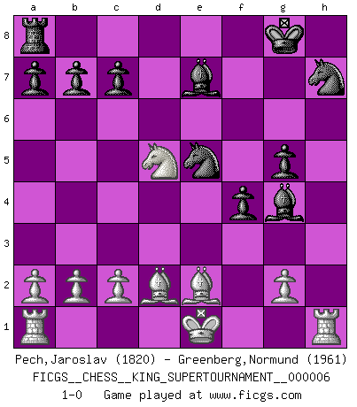 Last move : 1-0 2019 December 3 11:37:25 [Event "FICGS__CHESS__KING_SUPERTOURNAMENT__000006"] [Site "FICGS"] [Date "2019.09.02"] [Round "1"] [White "Pech,Jaroslav"] [Black "Greenberg,Normund"] [Result "1-0"] [WhiteElo "1820"] [BlackElo "1961"] 1.e4 e5 2.f4 exf4 3.Nf3 Be7 4.Bc4 h6 5.Bxf7+ Kf8 6.Ne5 Nf6 7.Bh5 g5 8.Ng6+ Kg7 9.Nxh8 Kxh8 10.e5 Nh7 11.h4 d6 12.hxg5 dxe5 13.d4 Nc6 14.dxe5 Qxd1+ 15.Bxd1 hxg5 16.Nc3 Nxe5 17.Bd2 Kg8 18.Be2 Bg4 19.Nd5 1-0 This chess game has been lost on time (started : 2019.09.02 1:48:4) KGA : Cunningham defense Player White won this chess game. Follow this game move after move (download)Not only will I predict his triumph over Botvinnik, but I'll go further and say that he'll probably be the greatest Chess player that ever lived. (John Collins) Das typische an einem Großmeister ist, daß er eine gewonnene Position schnell und schmerzlos gewinnt. (Irving Chernev) Alekhine es un poeta que crea un trabajo de arte de algo que raramente inspiraría a otra persona a mandar una tarjeta postal. (Max Euwe) Il s'avisa de me proposer d'apprendre les échecs qu'il jouait un peu... me voilà forcené des échecs. J'achète un échiquier, je m'enferme dans ma chambre, j'y passe des jours et des nuits à vouloir apprendre par cur toutes les parties. (Jean-Jacques Rousseau, Confessions) The meaning of life is that it is to be lived, and it is not to be traded and conceptualized and squeezed into a pattern of systems. (Bruce Lee)