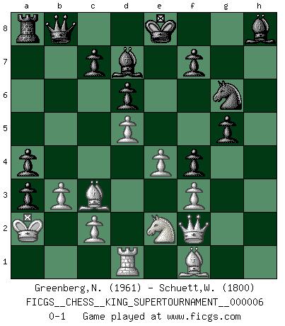 Last move : 0-1 2019 December 7 8:14:15 [Event "FICGS__CHESS__KING_SUPERTOURNAMENT__000006"] [Site "FICGS"] [Date "2019.09.02"] [Round "1"] [White "Greenberg,Normund"] [Black "Schuett,Wilhelm"] [Result "0-1"] [WhiteElo "1961"] [BlackElo "1800"] 1.e4 e5 2.f4 exf4 3.Nf3 g5 4.h3 Bg7 5.d4 h6 6.Nc3 Ne7 7.h4 Ng6 8.hxg5 hxg5 9.Rxh8+ Bxh8 10.Qe2 Nc6 11.d5 Nce5 12.Bd2 d6 13.O-O-O a6 14.Kb1 Qf6 15.Qf2 Nxf3 16.gxf3 b5 17.a3 Bd7 18.Bc1 Qd8 19.Bd2 Qb8 20.Ne2 a5 21.b3 b4 22.Ka2 bxa3 23.Bc3 a4 0-1 King's knight's gambit Queenside Castling by player White (move 13) Player Black won this chess game. Follow this game move after move (download)It was clear to me that the vulnerable point of the American Grandmaster (Bobby Fischer) was in double-edged, hanging, irrational positions, where he often failed to find a win even in a won position. (Efim Geller) Sehr viele beherrschen heutzutage das große Einmalseins des Schachspiels und kennen sogar dessen Logarithmentafeln auswendig - deshalb sollte man hin und wieder zu beweisen trachten, dass zwei mal zwei auch fünf sein kann. (Mikhail Nekhemyevich Tal) Coloca el contenido del tablero de Ajedrez en un sombrero, agita las piezas vigorosamente, derrámalas en el tablero desde una altura de medio metro y así obtienes el estilo de Wilhelm Steinitz. (H. E. Bird) D'abord les bases : Jouez et étudiez, puis étudiez et jouez, ensuite jouez et étudiez, puis étudiez et jouez. Deuxièmement : Donnez toujours le meilleur de vous-même ! (Ken Smith) To err is human, but to really foul things up requires a computer. (Farmer's Almanac, 1978)