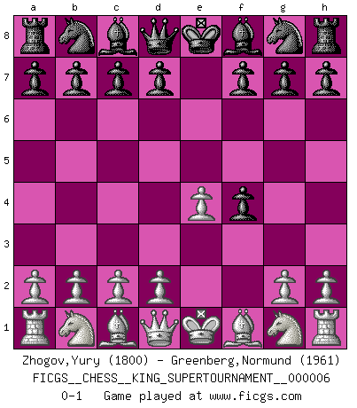 Last move : 0-1 2019 October 4 2:10:26 [Event "FICGS__CHESS__KING_SUPERTOURNAMENT__000006"] [Site "FICGS"] [Date "2019.09.02"] [Round "1"] [White "Zhogov,Yury"] [Black "Greenberg,Normund"] [Result "0-1"] [WhiteElo "1800"] [BlackElo "1961"] 1.e4 e5 2.f4 exf4 0-1 This chess game has been lost on time (started : 2019.09.02 1:48:4) King's gambit accepted Player Black won this chess game. Follow this game move after move (download)Some part of a mistake is always correct. (Savielly Tartakover) Die Auseinandersetzung mit Karpow war politisch geprägt. Er stand für das kommunistische System, wurde von dessen Repräsentanten gehätschelt. Ich war der Oppositionelle. Jeder Schachweltmeister spiegelt auch die gesellschaftlichen Verhältnisse wider. Kramnik steht für die Börsen-Generation des Neuen Markts, ideologiefrei, zahlenfixiert. (Garry Kasparov) El Ajedrez es parte de la cultura, y si una cultura esta en decadencia, entonces también el Ajedrez declinará. (Mikhail Botvinnik) Un journaliste : 'Vous préférez avoir une dame de plus sur l'échiquier ou au lit ?' Boris Spassky : 'Ca dépend de la position.' . 'gn is not allowed in chess unless n is an integer between 1 and 8 inclusive, where 1 and 8 are to interpreted as the standard numerals standing for integers in the ordered real-closed field R, with the *canonical* ordering. (As opposed to, say, an integer in the domain Z[2+i*sqrt(5)] or an integer in some exotic Grothendieck topos). (Normajean Yates)