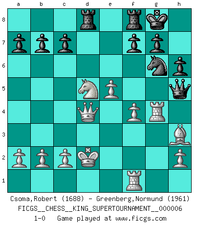 Last move : 1-0 2019 November 24 7:23:32 [Event "FICGS__CHESS__KING_SUPERTOURNAMENT__000006"] [Site "FICGS"] [Date "2019.09.02"] [Round "1"] [White "Csoma,Robert"] [Black "Greenberg,Normund"] [Result "1-0"] [WhiteElo "1688"] [BlackElo "1961"] 1.e4 e5 2.f4 exf4 3.Nf3 Be7 4.d4 Bh4+ 5.Ke2 d5 6.e5 Bg4 7.Bxf4 Bxf3+ 8.gxf3 Bg5 9.Qd2 h6 10.Nc3 Bxf4 11.Qxf4 Ne7 12.Bh3 Nbc6 13.Rhg1 Ng6 14.Qe3 O-O 15.f4 Qh4 16.Raf1 Rae8 17.Nxd5 Nxd4+ 18.Kd2 Rd8 19.Rg4 Qh5 20.Qxd4 1-0 This chess game has been lost on time (started : 2019.09.02 1:48:4) KGA : Cunningham defense Kingside Castling by player Black (move 14) Player White won this chess game. Follow this game move after move (download)When you don't know what to play, wait for an idea to come into your opponent's mind. You may be sure that idea will be wrong. (Siegbert Tarrasch) Das Schachspiel ist ein See, in welchem eine Mücke baden und ein Elefant ertrinken kann. (Emanuel Lasker) El ganar no lo es todo... pero el perder es nada. (Mednis) Pour moi, les échecs ne sont pas un jeu mais un art. (Alexandre Alekhine) I teach you to lie, cheat and steal, and as soon as my back's turned you wait in line ? (Gregory House, House M.D.)